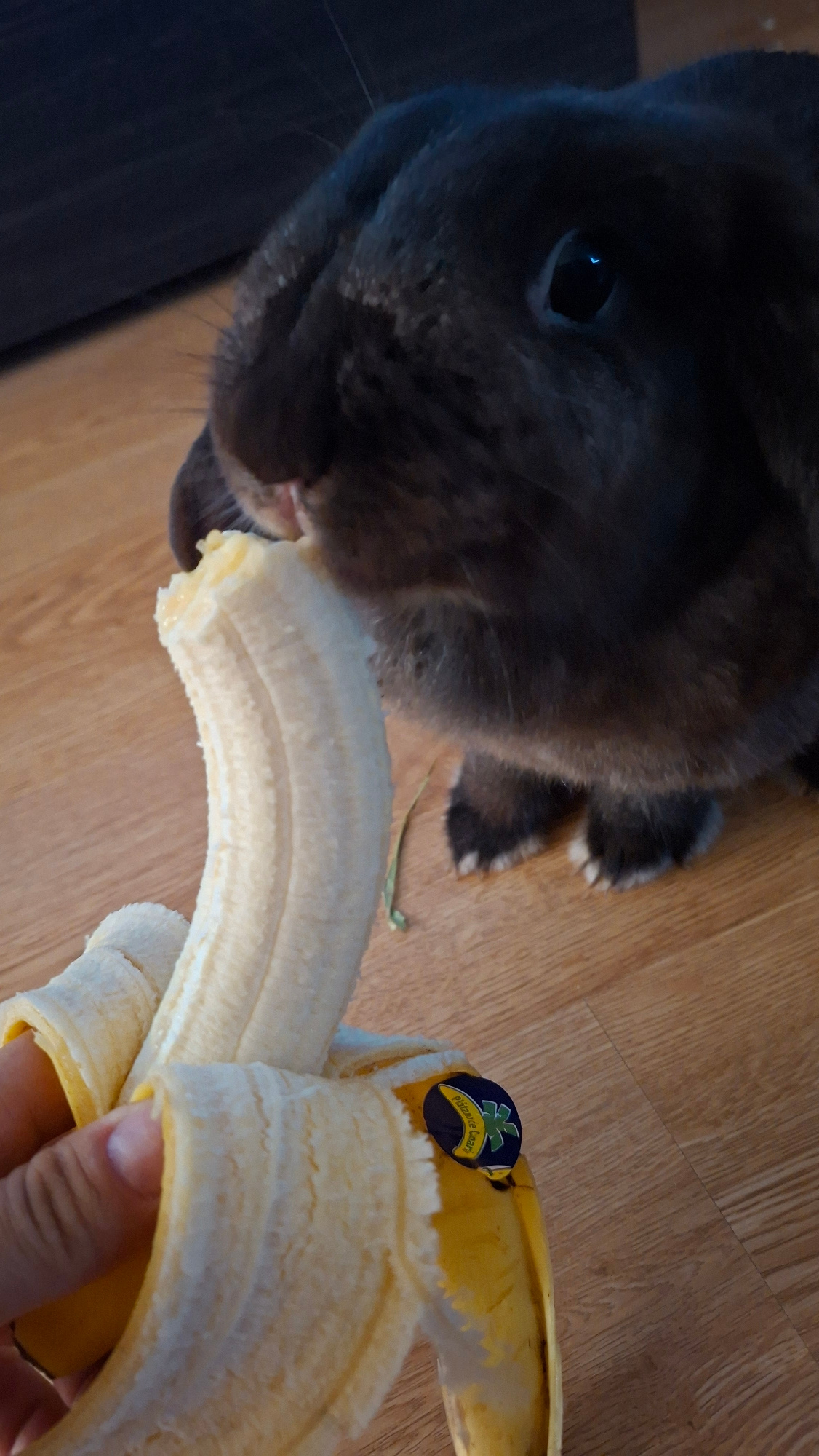 A close-up shot shows a gray rabbit eating a peeled banana. The banana is being held by a hand, and a sticker that says "Platano de Canari" is visible on the banana peel. The background is a wooden fl…read more