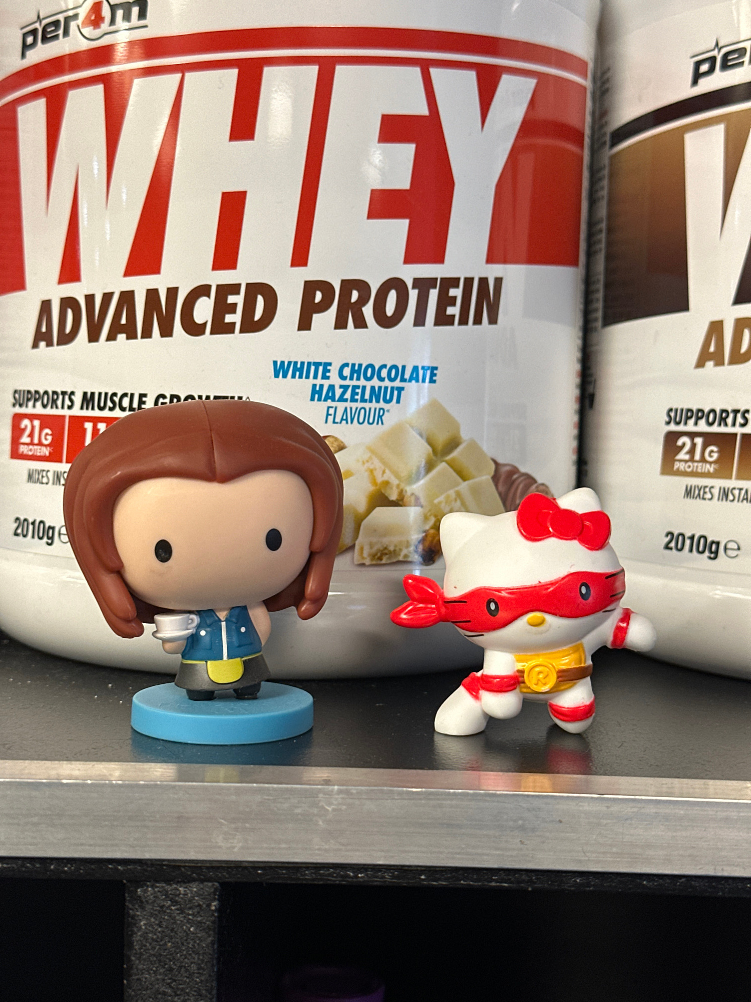 The image shows a shelf with two tubs of per4m whey protein powder. The tub in the foreground is "White Chocolate Hazelnut Flavour" and the tub behind is "Advanced" or "Chocolate" flavour. Two small fâŚread more