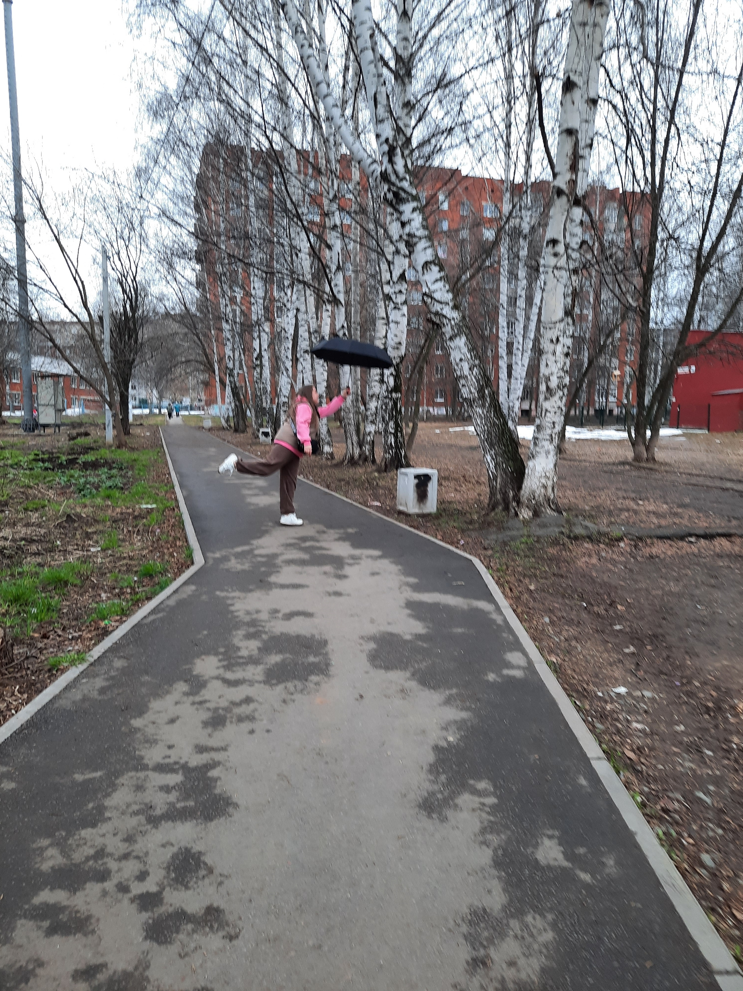 A person in a pink jacket and brown pants is walking on a gray concrete sidewalk in Izhevsk, Russia. The sidewalk has dark patches, indicating it is wet. The person is holding a black umbrella. Beside…read more
