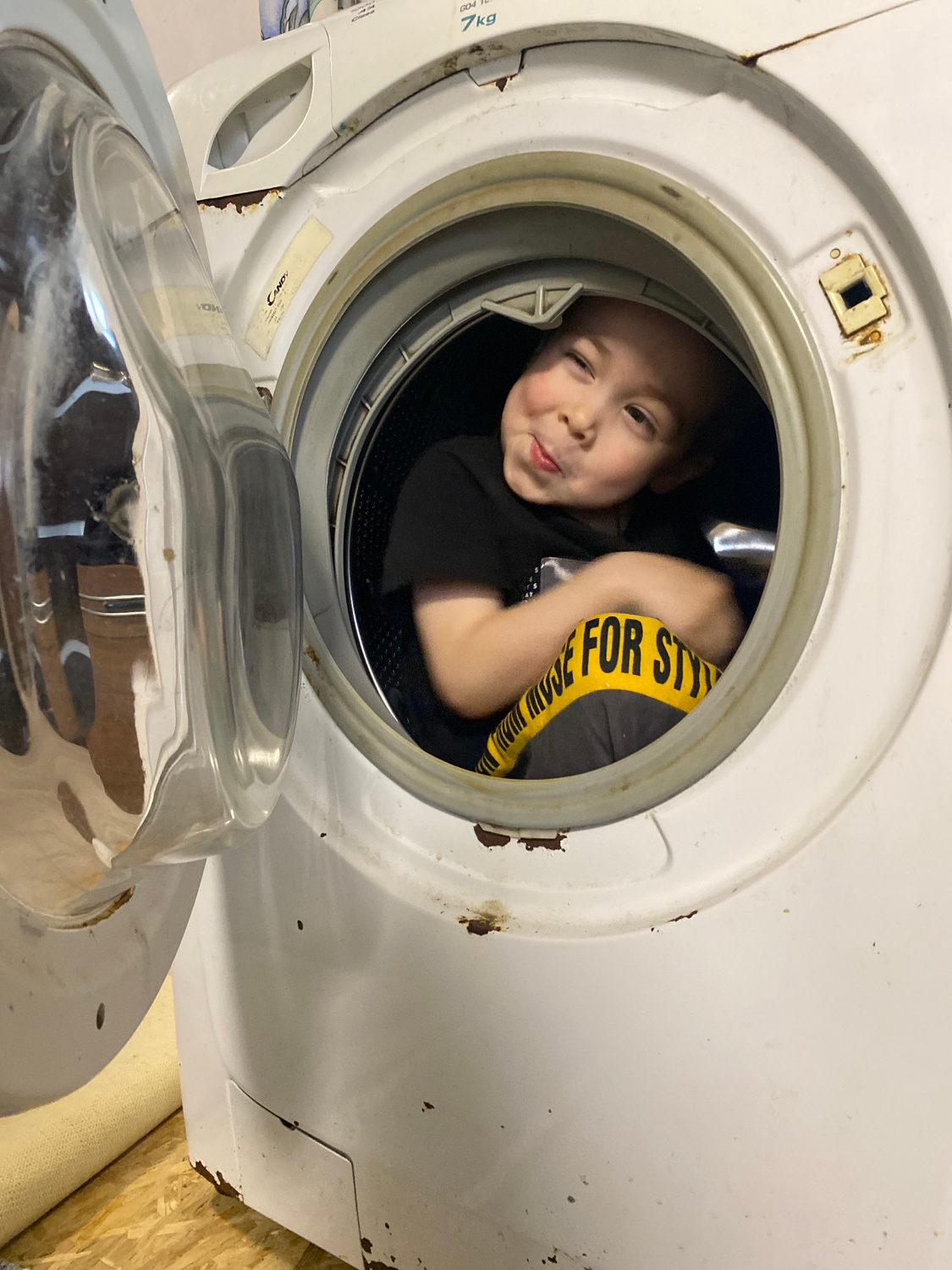This indoor photograph, taken in Noviy, Russia, captures a young child playfully positioned inside the drum of an old, front-loading washing machine. The child, likely a boy, is seen from the chest up…read more