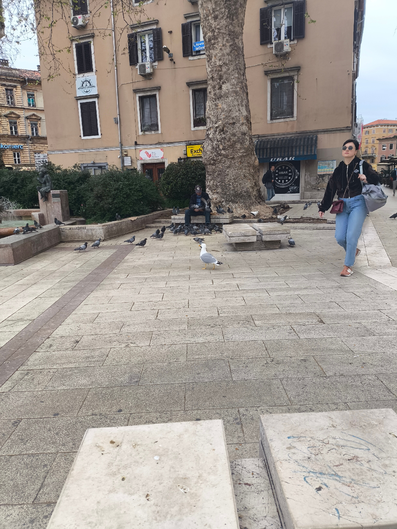 In Grad Rijeka, Croatia, a young woman walks across a stone-paved square. She wears a dark jacket, light blue jeans, and sneakers, carrying a gray shoulder bag and a small red purse. A seagull stands…read more