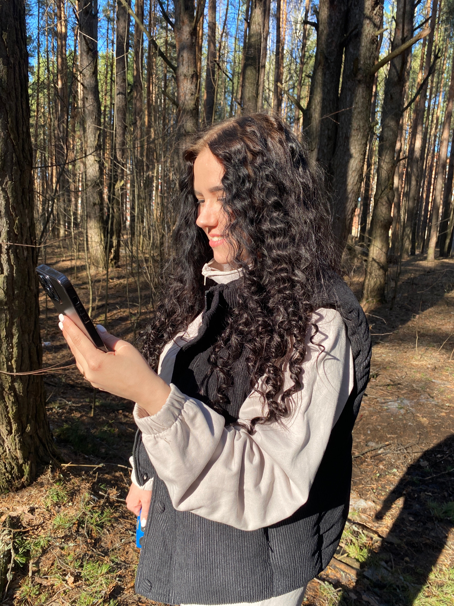 A woman with long, dark, curly hair is outside, looking down at a black smartphone in her hands. She is wearing a layered outfit consisting of a white shirt, a light-colored jacket with gathered sleev…read more