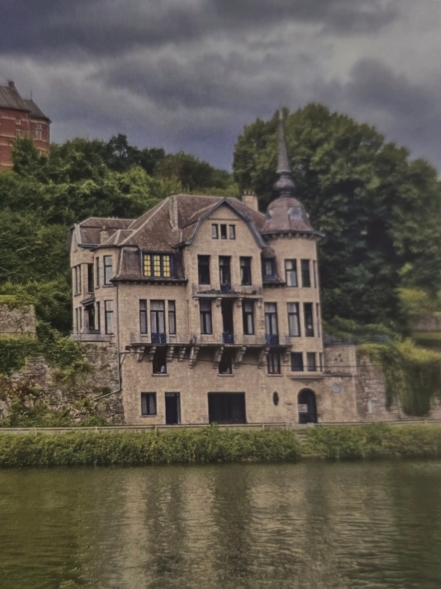 The image presents a grand, multi-story building, reminiscent of a chateau or large historical residence, set against a backdrop of lush natural scenery. The building, constructed from light-colored s…read more