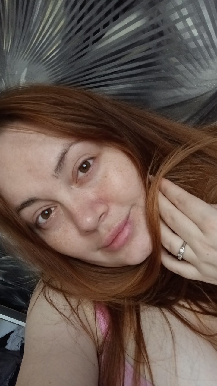 A woman with light skin and reddish-brown hair is lying down. She is wearing a leopard-print shirt and a thin silver necklace. She is looking directly at the camera. Her right arm is raised above her…read more