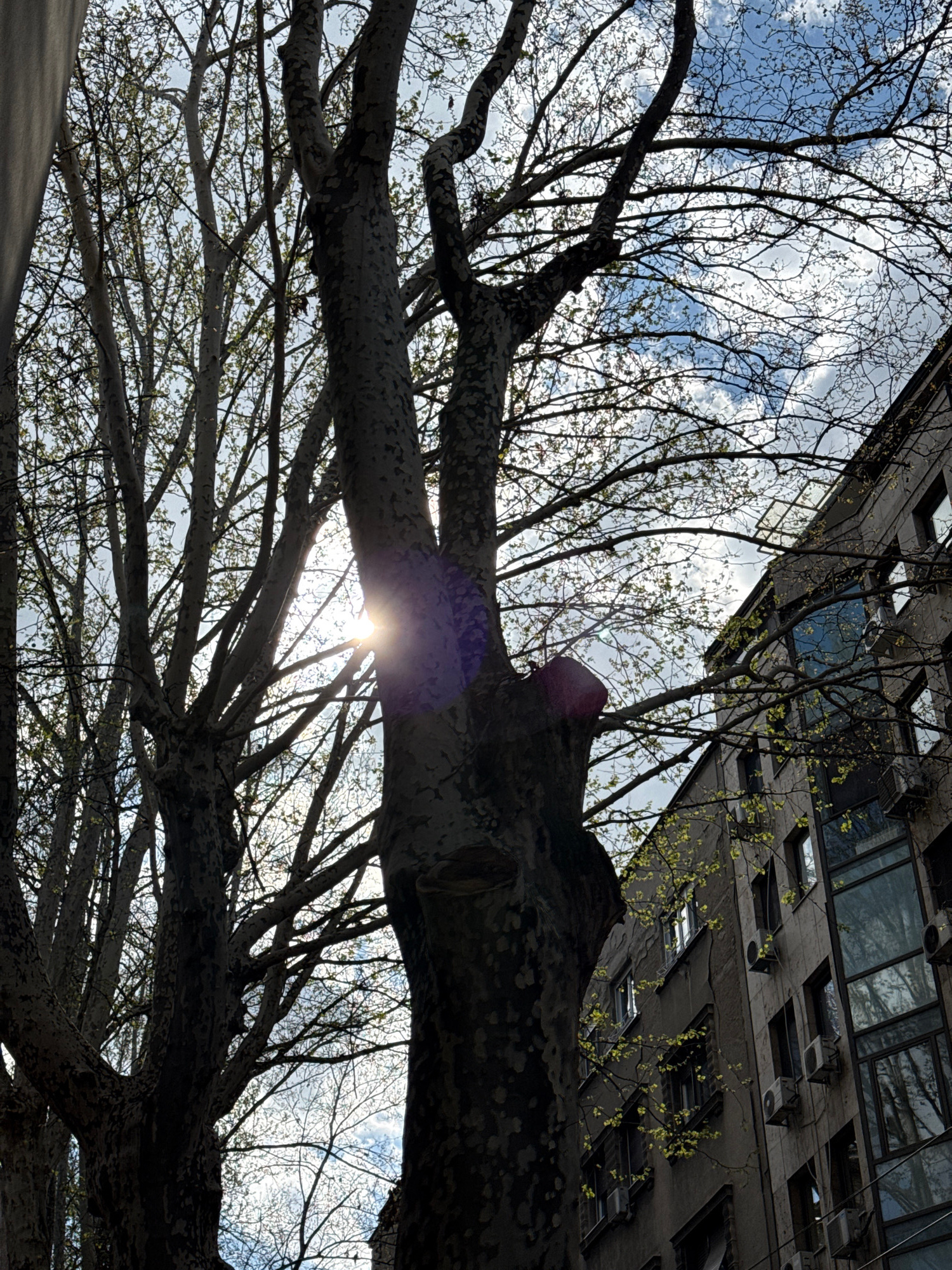 The image is an upward-looking perspective of tree branches against a backdrop of a building and a partly cloudy sky. The tree's bark exhibits a mottled pattern. The building is of a concrete structure with multiple windows and what appear to be air conditioning units. The sun is visible through the branches, creating a lens flare. The sky is a mix of blue and white with scattered clouds. The image was likely taken in the city of Belgrade, Serbia, based on the user's request. | Open Wire