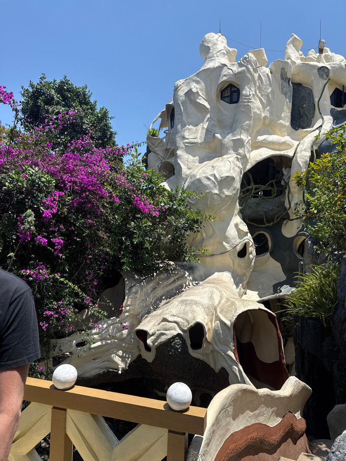 The image displays a portion of the Hằng Nga Guesthouse, known as the "Crazy House," located in Da Lat, Vietnam. The prominent subject is a multi-story, deconstructivist building with an organic, scul…read more