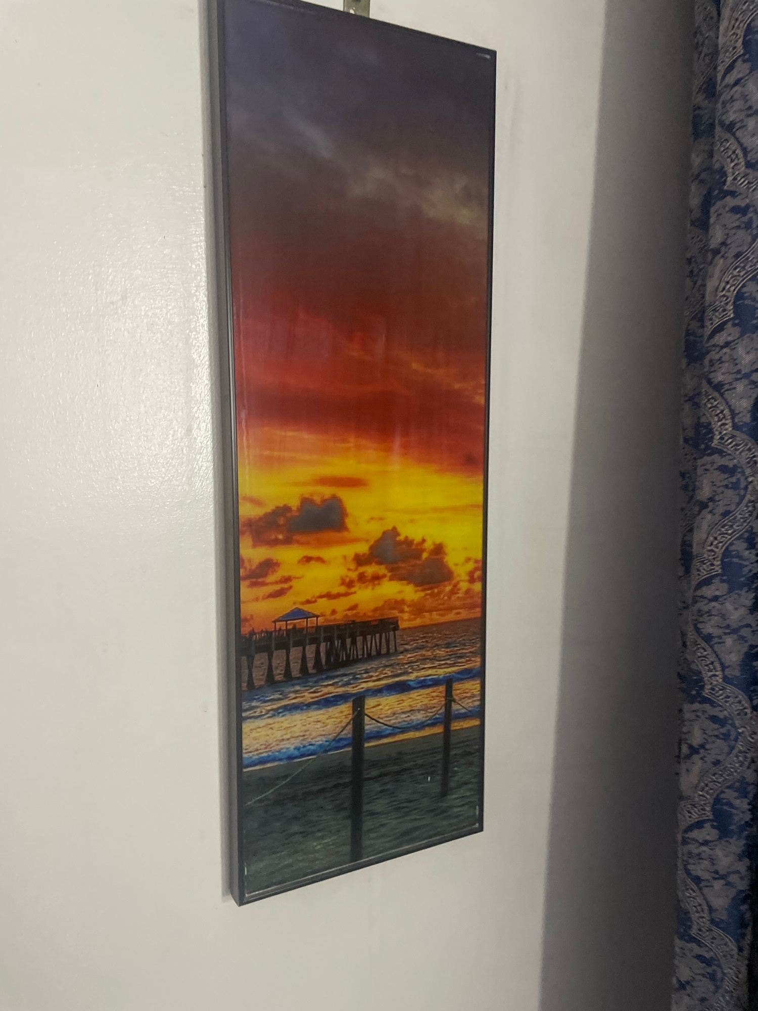 A landscape painting hangs on a white wall, with a blue patterned textile visible above. The painting depicts a sunset over the ocean, with a pier extending into the water. The colors are primarily or…read more