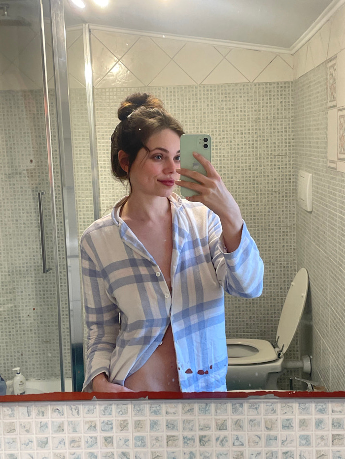 A female subject is depicted in a bathroom, captured via a mirror selfie. The subject, with dark hair tied in a bun, wears a light blue and white plaid button-up shirt, partially unbuttoned to expose…read more