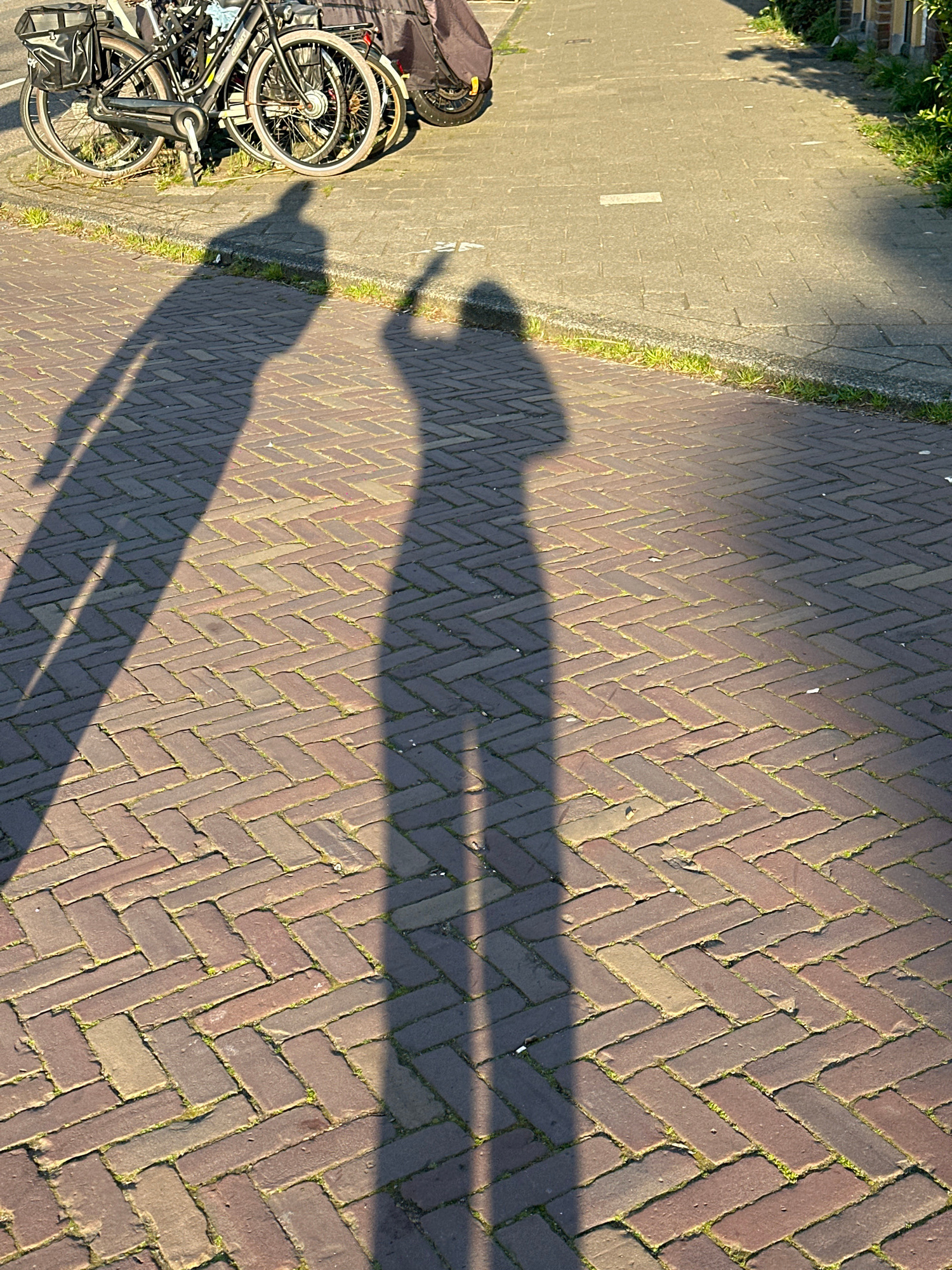 The image shows a section of a brick-paved street, likely in Amsterdam, Netherlands. A line of parked bicycles is visible along the edge of a grey paved sidewalk. A long shadow cast by a person holdin…read more