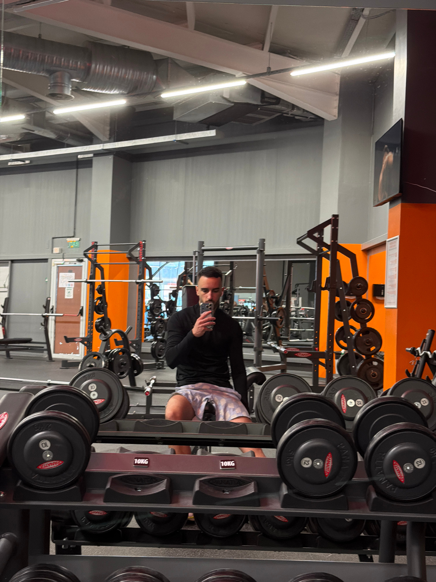 A man is taking a selfie in a gym. The gym has weight racks filled with black and grey weight plates. In the background are other gym equipment such as squat racks and weight machines. The ceiling has…read more