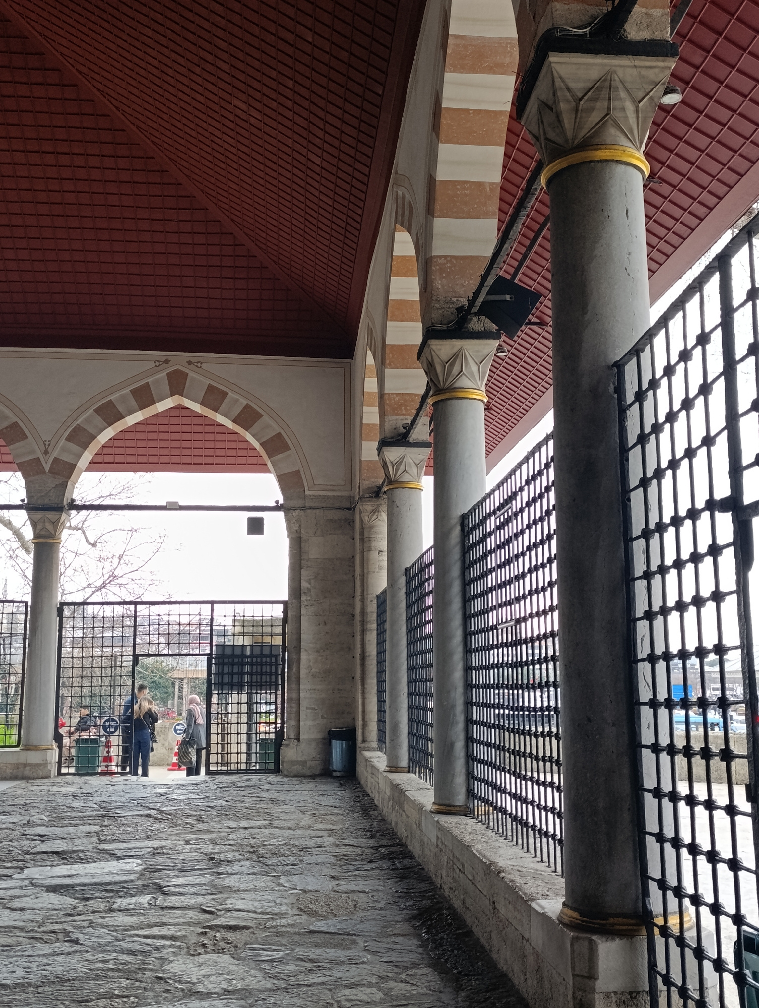 The image depicts a covered walkway with stone columns and a red tiled roof in Üsküdar, Turkey. A wrought-iron fence runs along the side of the walkway, secured to the stone columns. People are visibl…read more