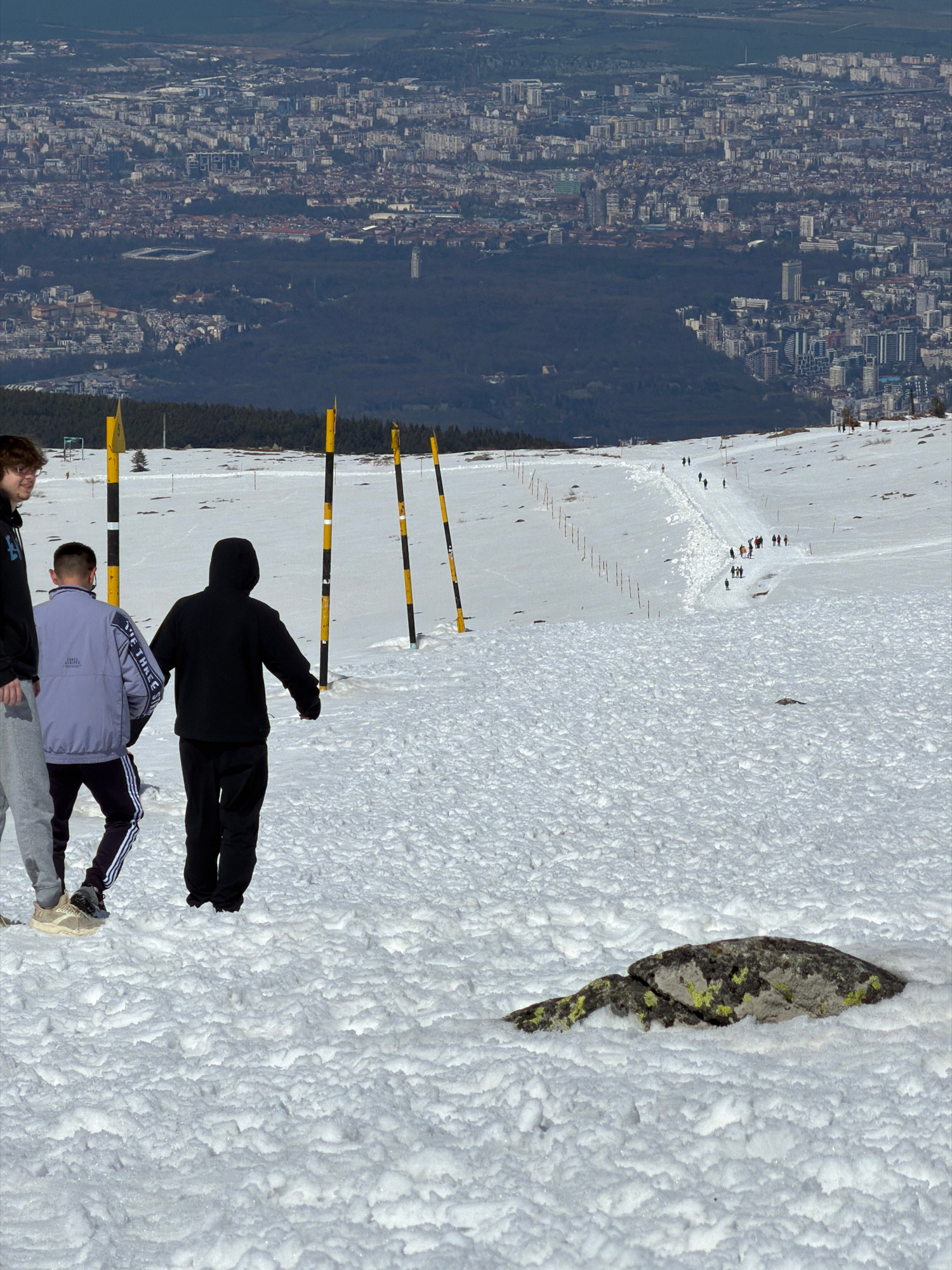 The image shows a view from a snowy mountain, likely near Bistritsa, Bulgaria, as a city is visible in the background. The foreground shows a group of people, including one in a black hooded jacket ly…read more