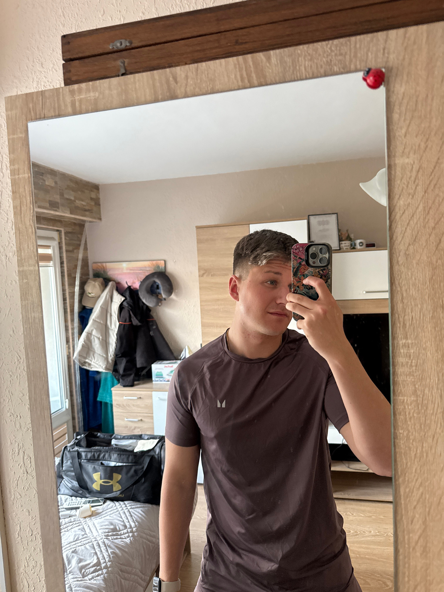 A person is taking a selfie in a mirror. The person has short brown hair and is wearing a brown shirt. The mirror is framed with a light-colored wood. In the reflection, there is a bed with a white qu…read more