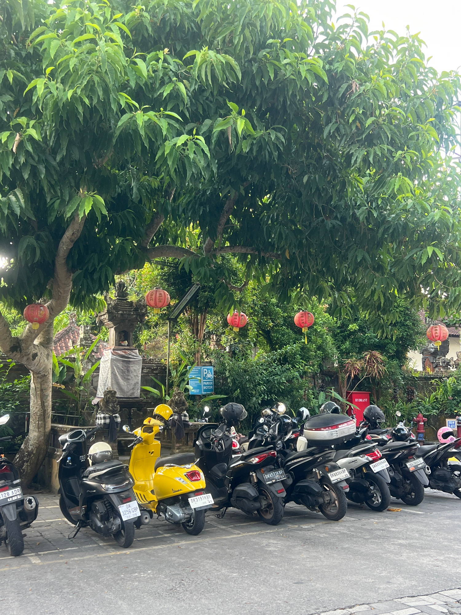 The image captures a street scene in Ubud District, Indonesia, showcasing a mix of natural and urban elements. A large, leafy tree dominates the left side of the frame. Red lanterns are hanging amidstβ¦read more