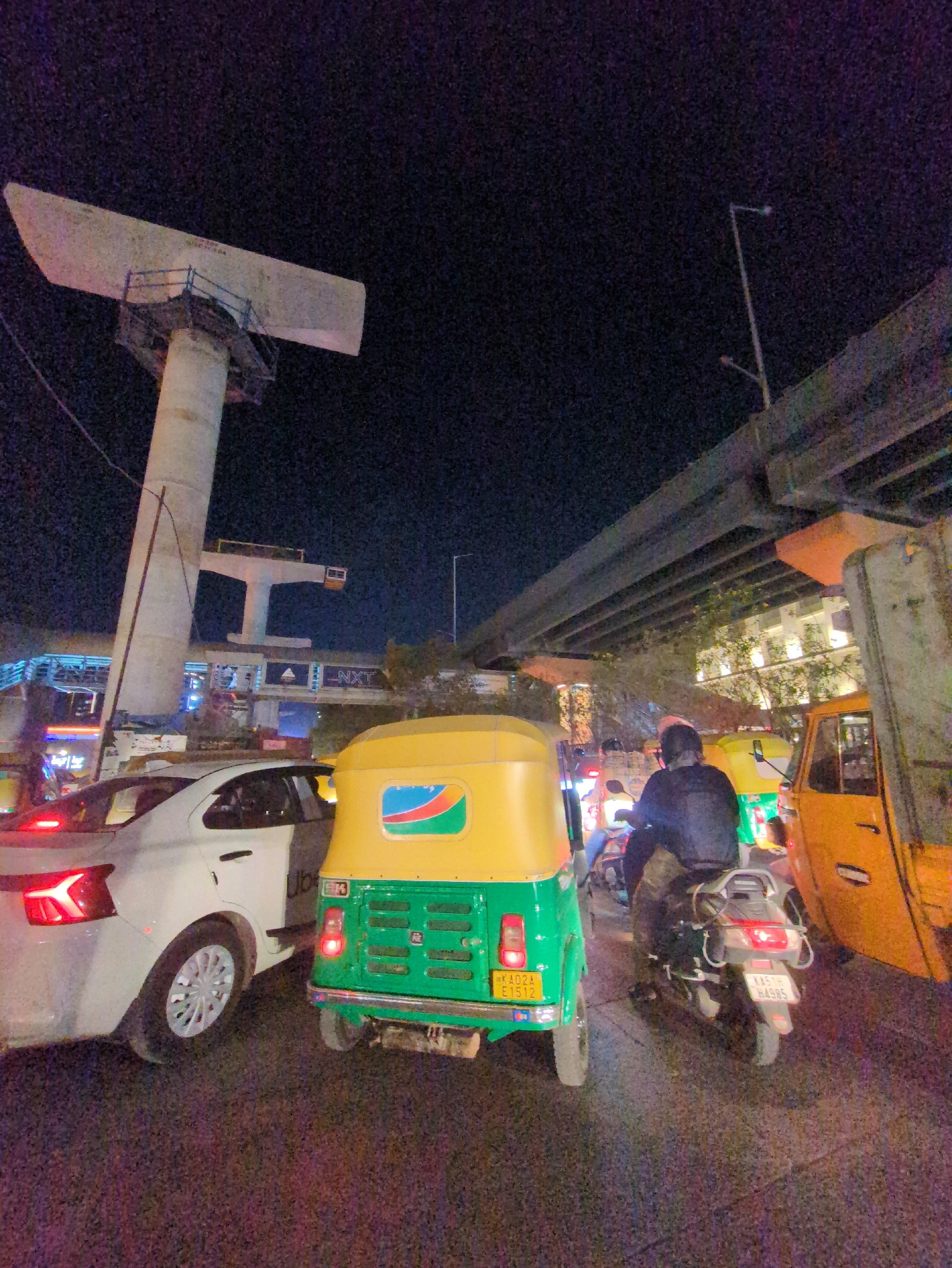 Captured at night, the image shows a bustling street scene in Bengaluru, India. A green and yellow auto-rickshaw, bearing the license plate KA02A E1572, is parked alongside a white car with unique Y-s…read more