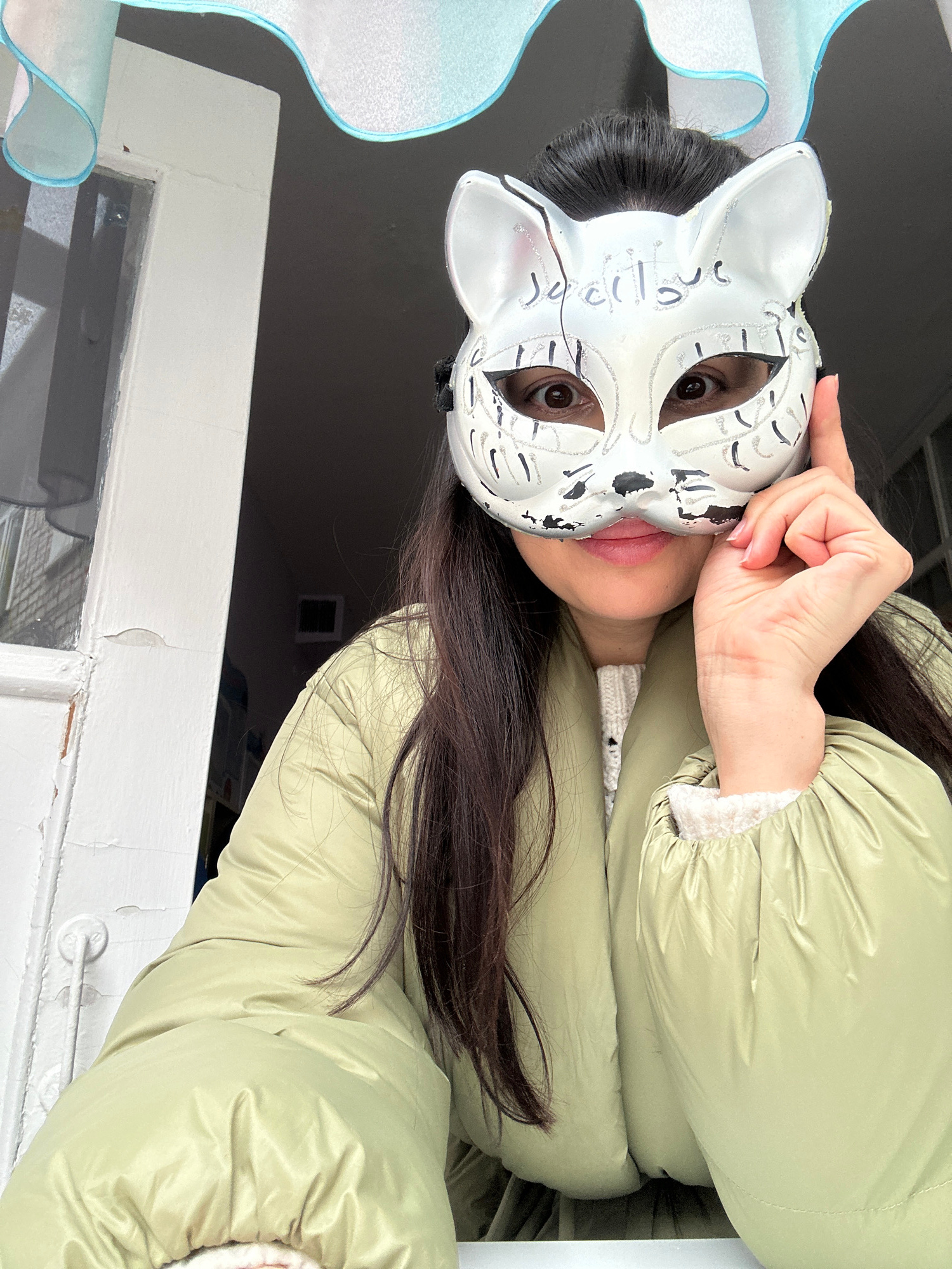A person wearing a light green puffer jacket and a white cat mask is visible. The person is standing near a white window frame with peeling paint. The location is Chaikovsky, Russia.