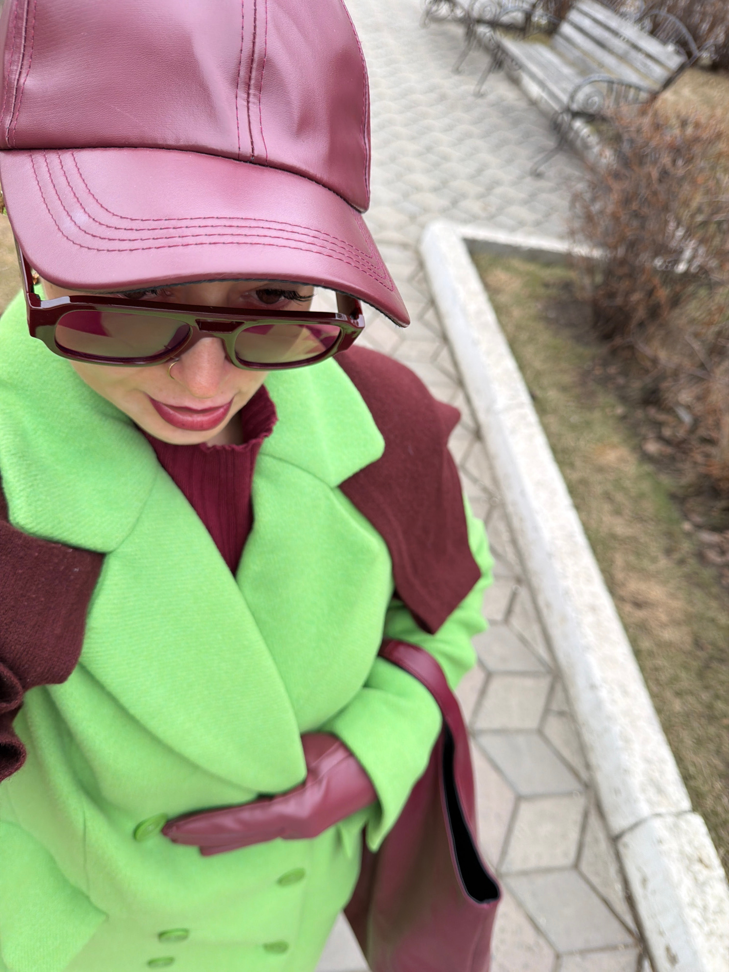 A medium-shot, high-angle, color photograph depicts a person wearing a burgundy leather cap, matching sunglasses, a green wool coat with burgundy accents, and burgundy leather gloves. The person is la…read more
