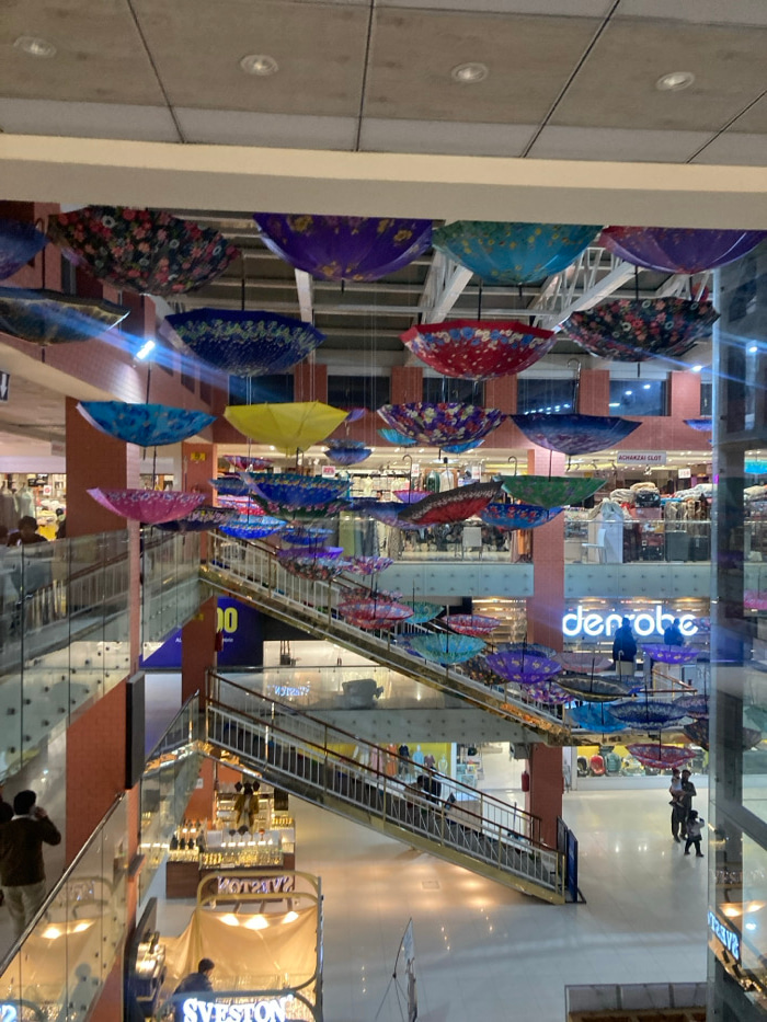 This image depicts the interior of a multi-story indoor shopping mall or commercial complex in Quetta City Tehsil, Pakistan. The primary visual element is a dense overhead installation of numerous bri…read more