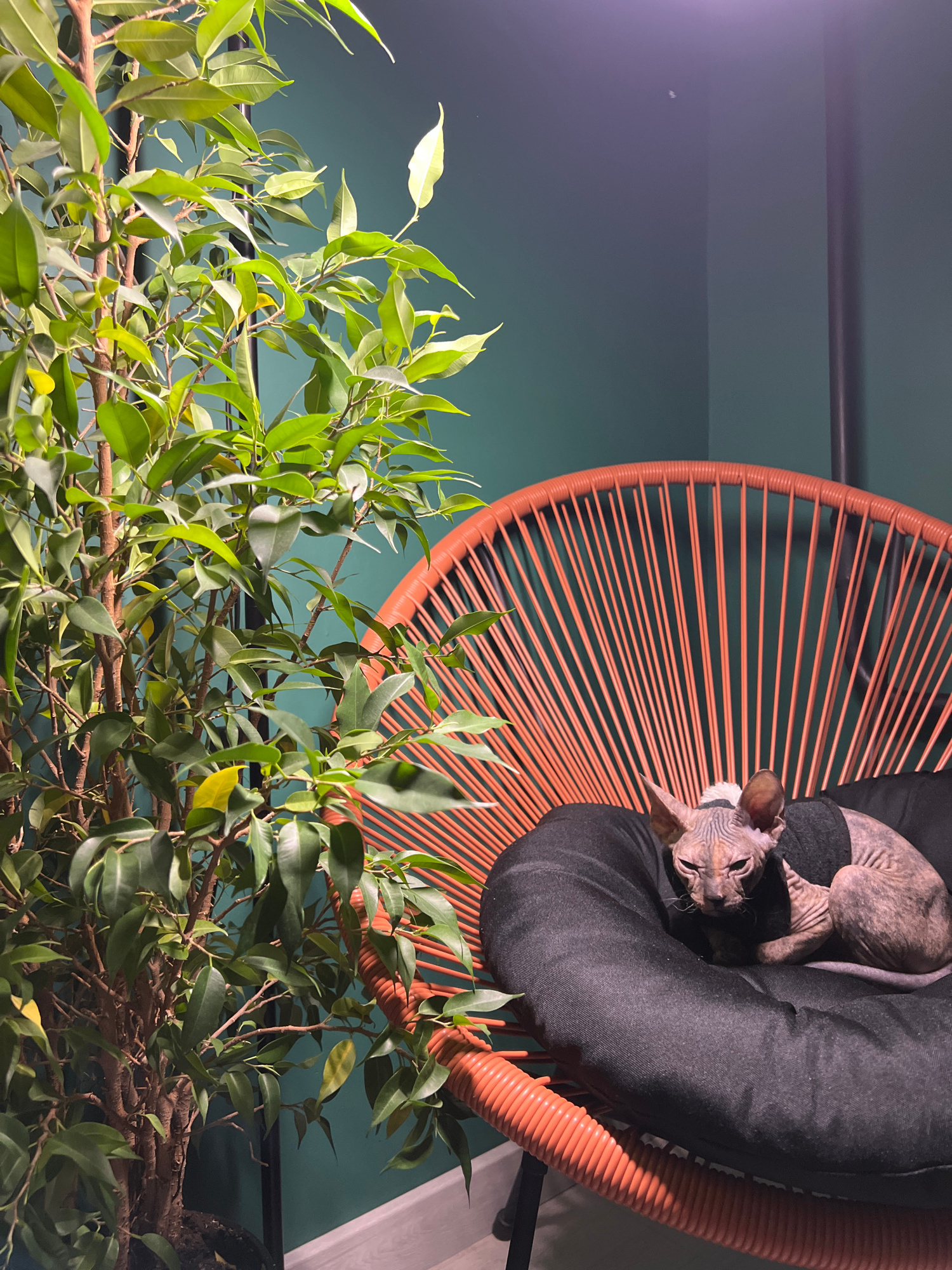 A sphynx cat, wearing a dark grey garment with a white trim at the neck, is resting in a black cushion within an orange wicker chair. Below the chair, a leafy green houseplant is visible. The backgrou…read more