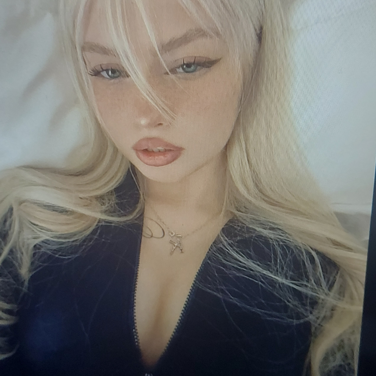 The image shows a fair-skinned person with long, straight platinum blonde hair, lying down and looking upwards towards the camera. The head is tilted, with hair framing the face and falling across a w…read more