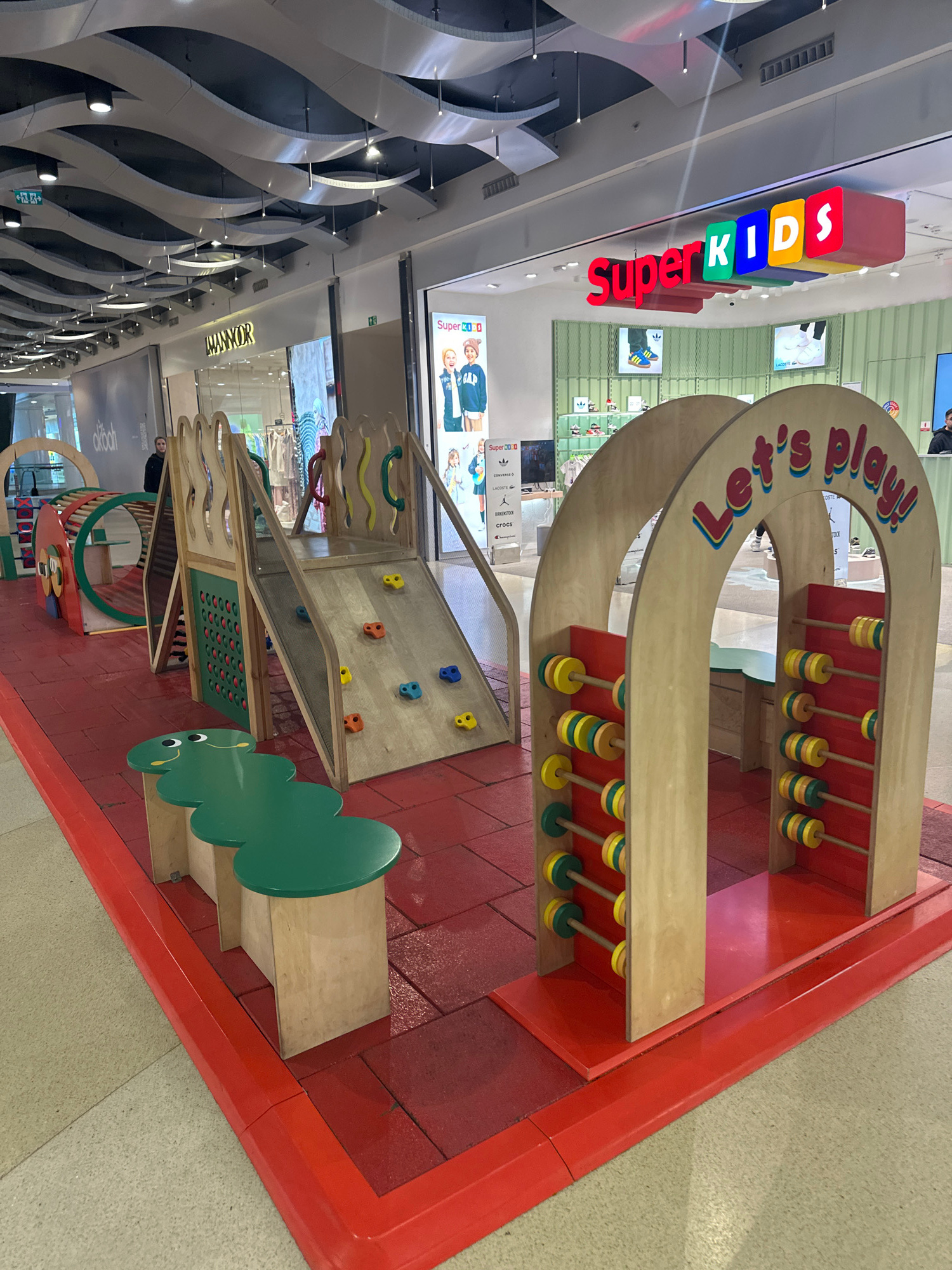 The image depicts an indoor children's playground located inside a shopping mall in Esenyurt, Turkey. The playground is surrounded by retail stores, including SuperKids. The playground equipment incluβ¦read more
