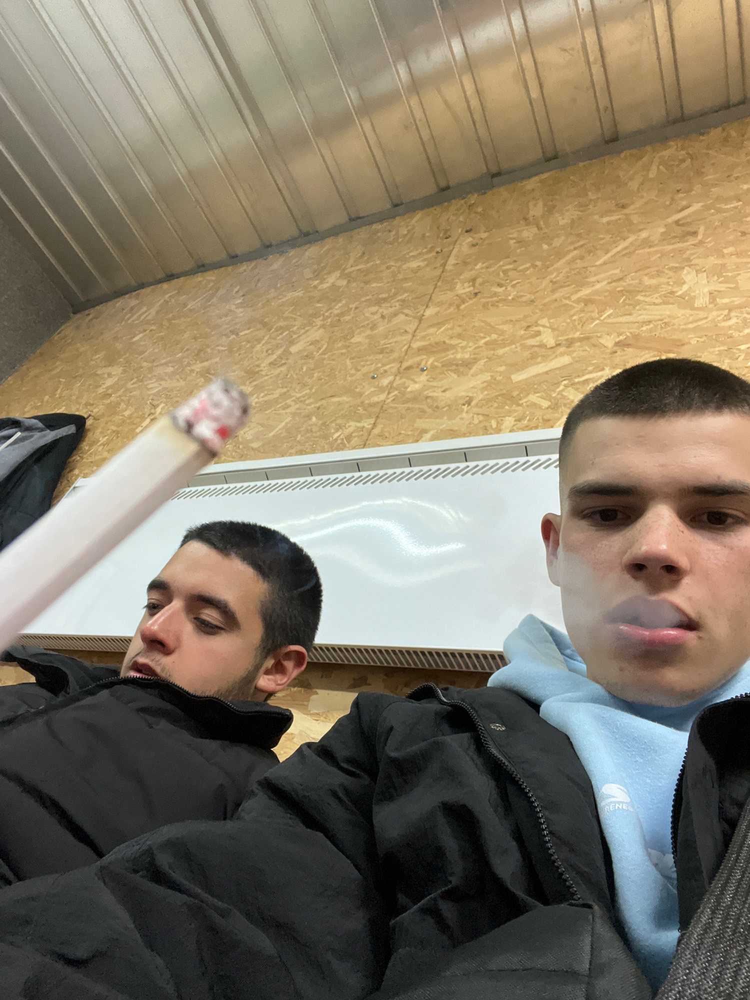 Two men are indoors. The man on top exhales smoke. He wears a light blue hooded sweatshirt under a black jacket. The other man holds a lit cigarette. He also wears a black jacket. A white radiator is…read more