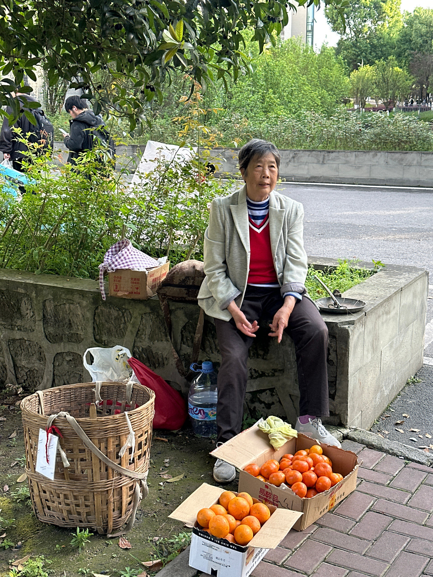 An elderly Asian woman sits outdoors on a concrete ledge. She wears dark pants, a red sweater, and a light gray jacket. Beside her are two cardboard boxes filled with oranges. A woven basket sits on t…read more