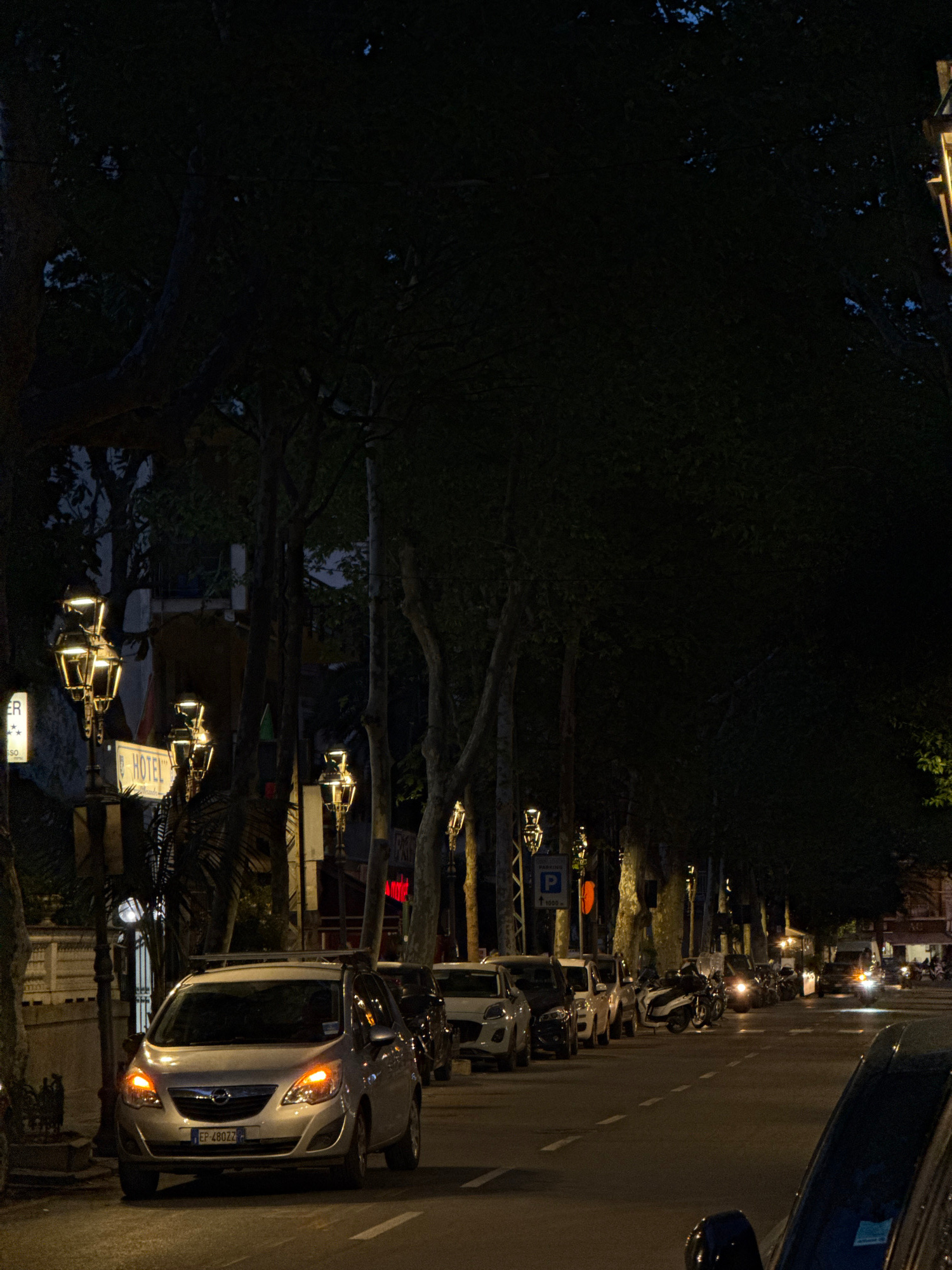 The image is taken at night in Sanremo, Italy. The street is lined with parked cars and scooters. Street lamps illuminate the sidewalk adjacent to the road. Trees are visible to the left. The shot app…read more