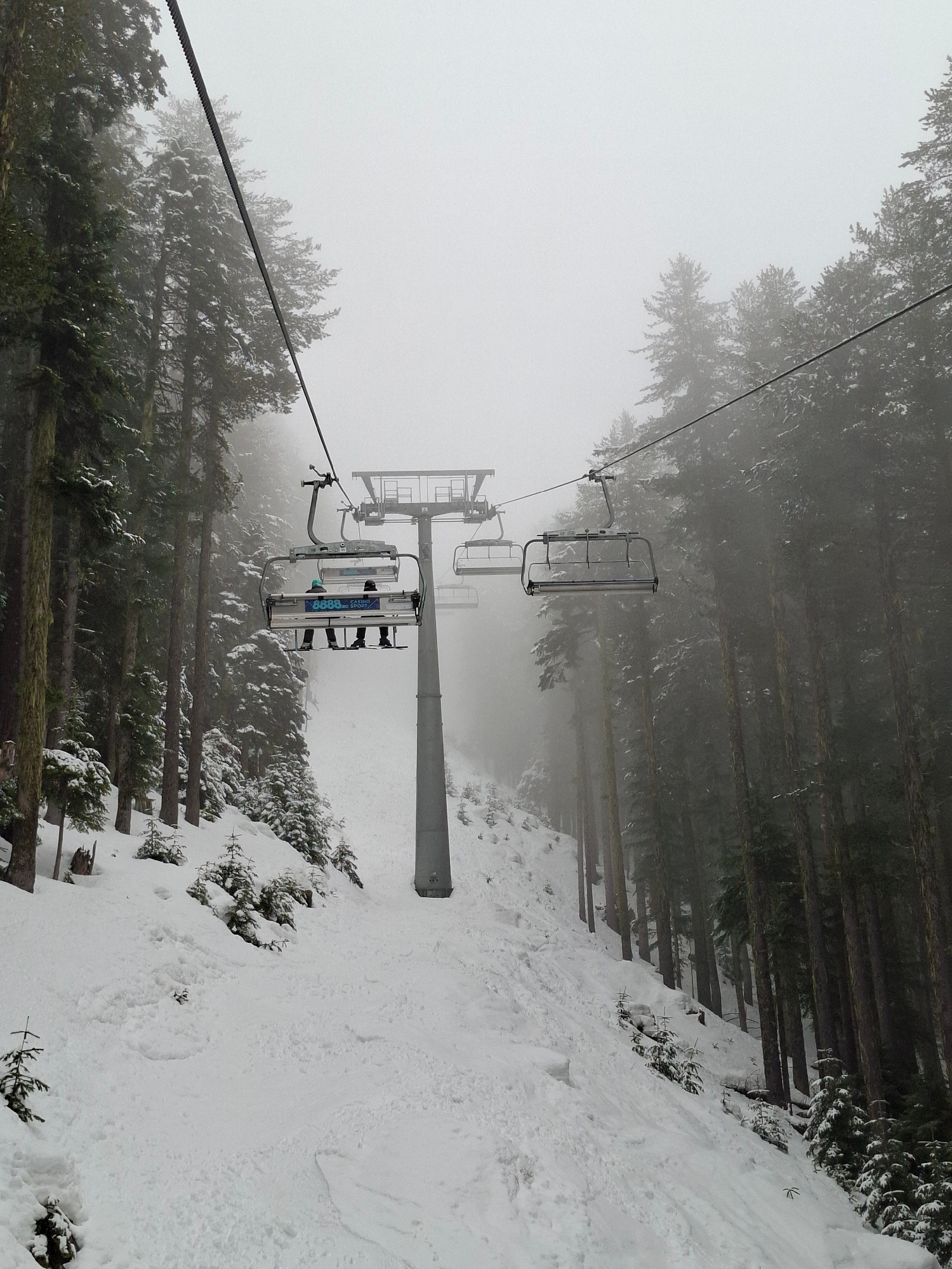 The image shows a ski lift at a ski resort. The lifts are unoccupied except for one displaying an advertisement for "Casino Big Sports." The surroundings are covered in snow with trees visible on eith…read more