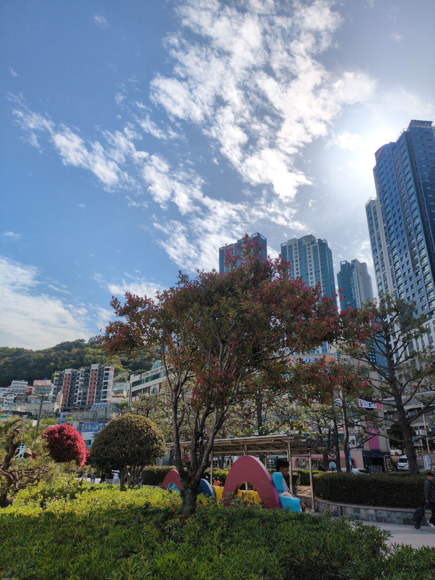 The image depicts a cityscape in Busan, South Korea, under a partly cloudy sky. Tall, blue high-rise buildings dominate the left side of the frame, contrasting with the blue sky and scattered white cl…read more