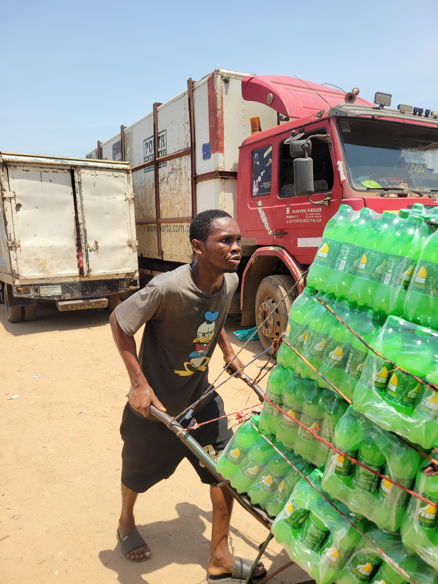 In Onitsha, Nigeria, a man strains to push or pull a heavily laden handcart filled with green bottled beverages on a sunny day. The man, seen in profile, wears a grey t-shirt with a colorful cartoon gā¦read more
