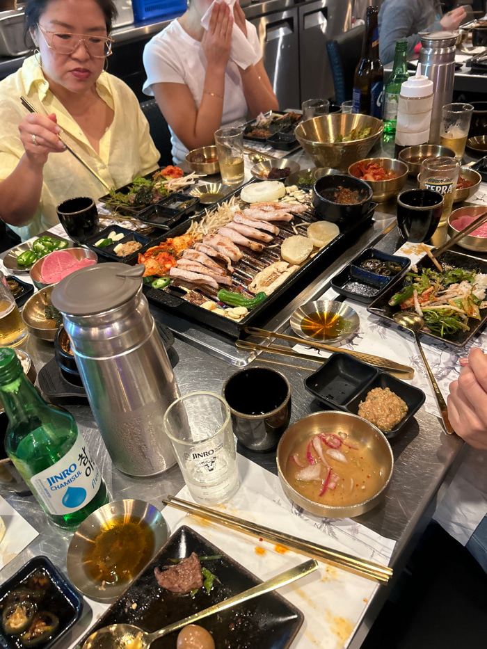A Korean barbecue meal in progress. A grill with pork belly and vegetables dominates the table, surrounded by small dishes of kimchi, sauces, and other banchan. Jinro soju bottles, a steel pitcher, an…read more