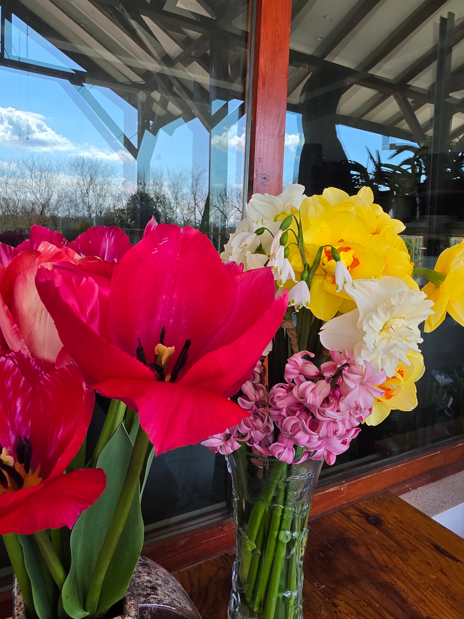 A still-life photograph shows an arrangement of brightly colored flowers. Dominating the foreground are two red tulips, their petals fully open, revealing dark interiors and stamen. Behind the tulips…read more