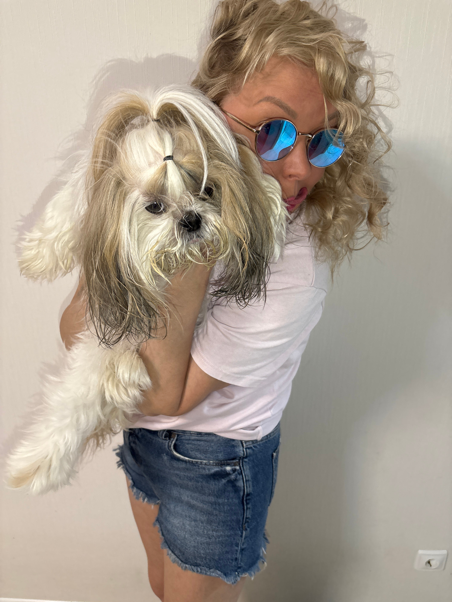 A blonde woman wearing blue sunglasses and a white t-shirt is lying on her side, embracing a Shih Tzu dog with white and brown fur. The woman is also wearing blue denim shorts. They are lying on a whi…read more