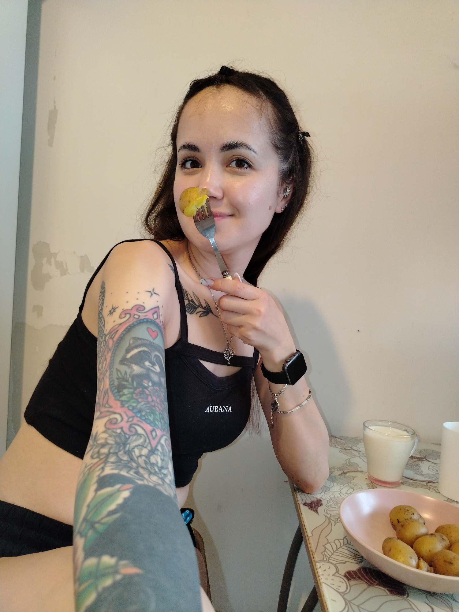 A fair-skinned woman with long, dark hair pulled back from her face is seated at a table and holding a piece of food on a fork in front of her nose. She is smiling and looking directly at the camera.β¦read more