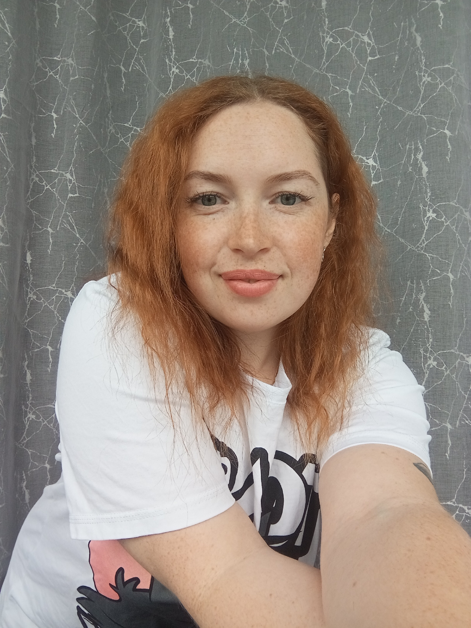 A young woman with red hair and freckles is lying on a gray surface with a white marble-like pattern. She is wearing a white t-shirt with a black and white graphic design. Her eyes are light-colored,…read more