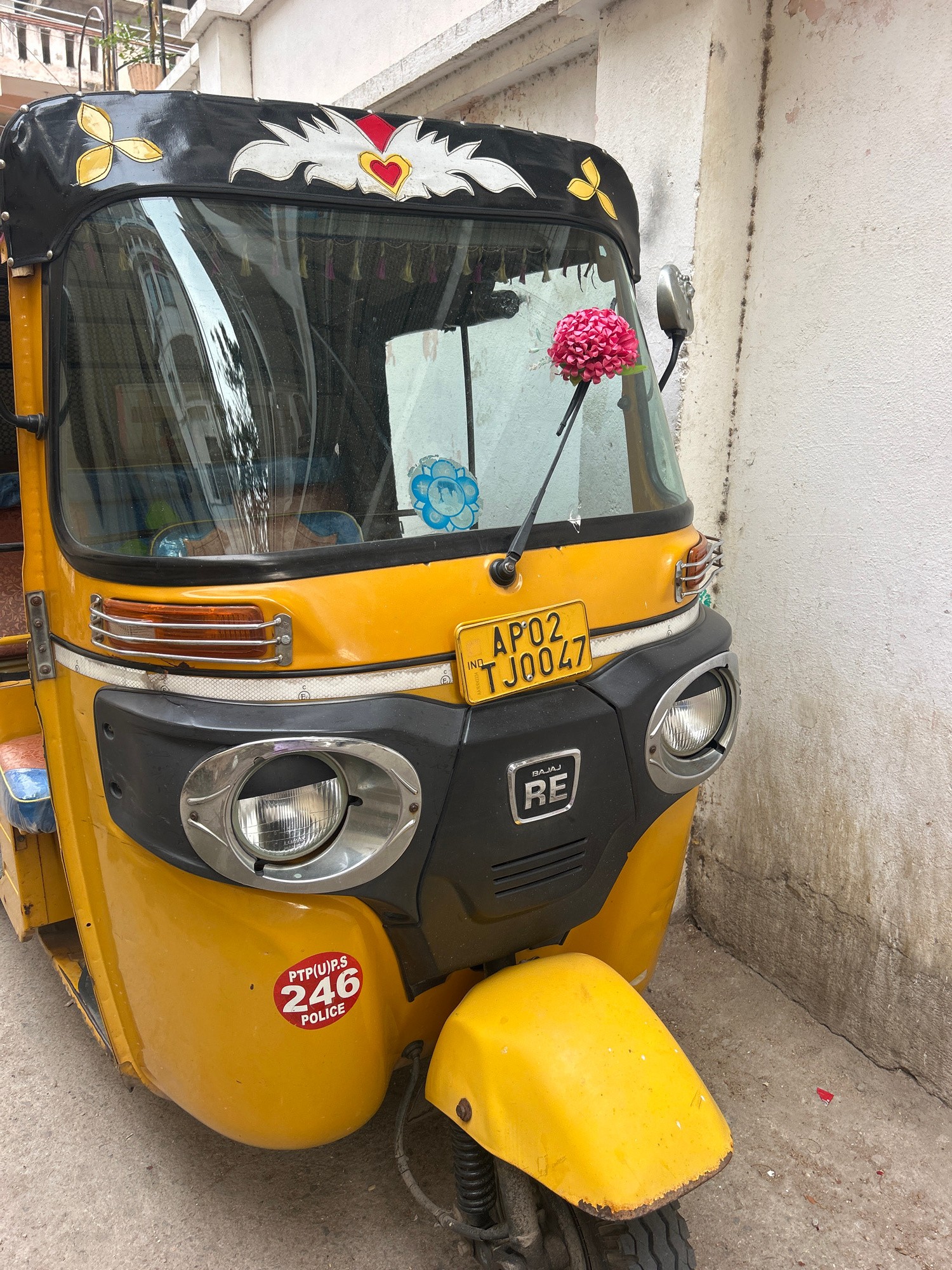 The image shows a three-wheeled autorickshaw parked near a wall in Puttaparthi, India. The vehicle is primarily yellow with a black roof decorated with white and gold designs. A pink pom-pom and a blu…read more