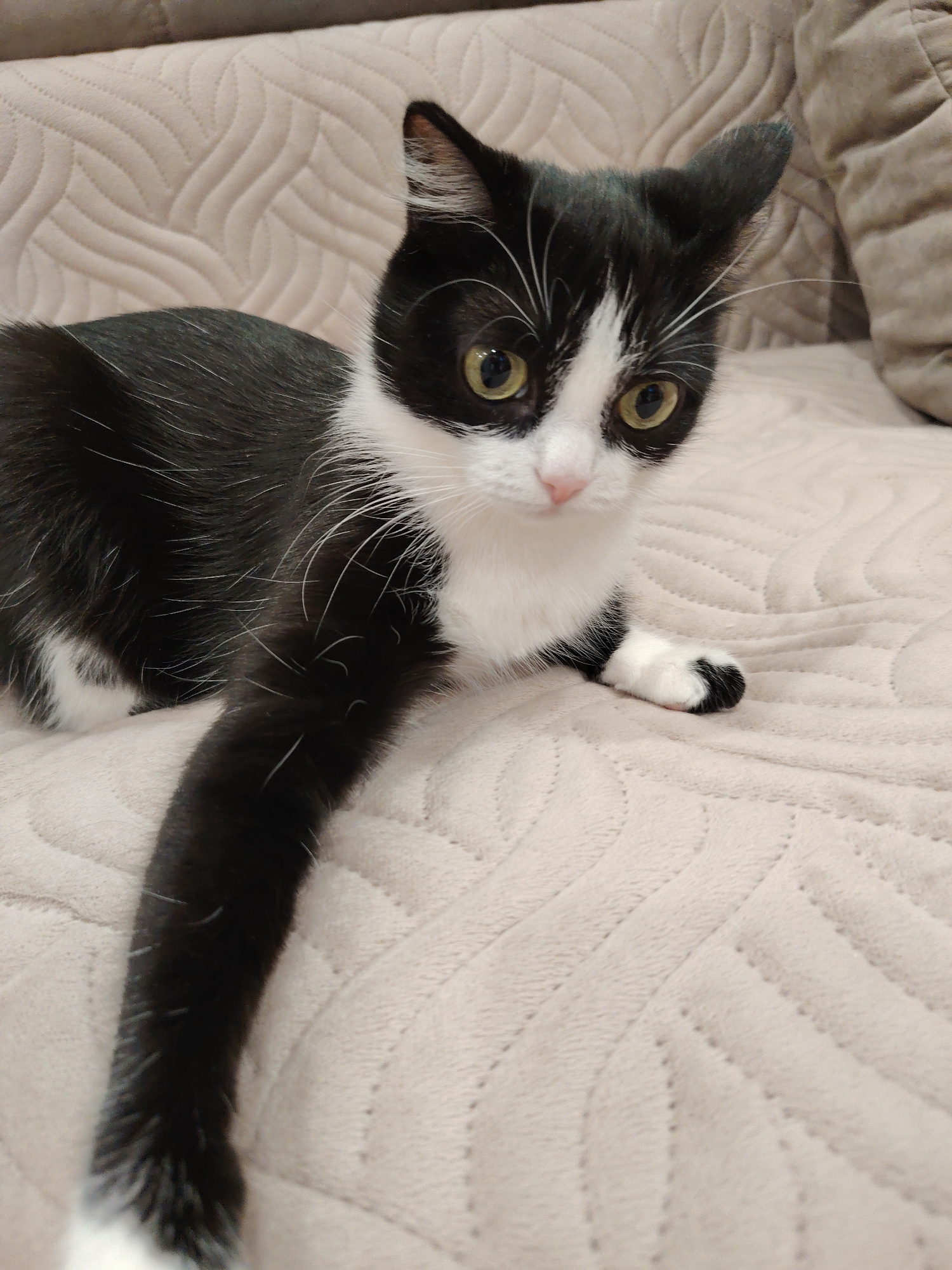 A black and white cat is lying on a beige quilted blanket. The cat has a white chest, face, and paws, with black fur covering the rest of its body. It is looking forward with alert, yellow eyes. The c…read more
