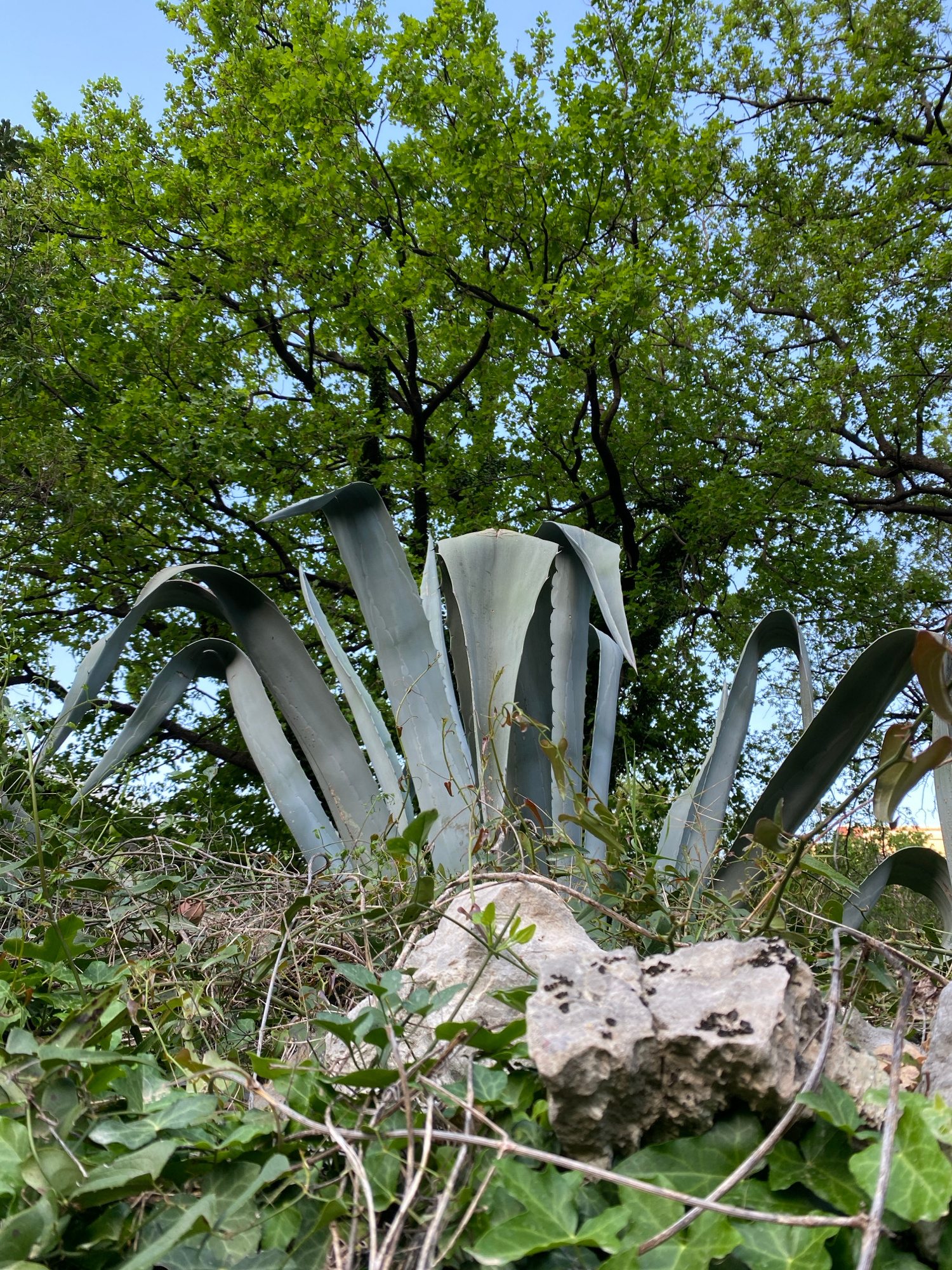 This upward-angled, daytime image captures a vibrant natural scene, likely within a garden or natural landscape in Budva, Montenegro. The frame is dominated by lush vegetation set against a clear, lig…read more