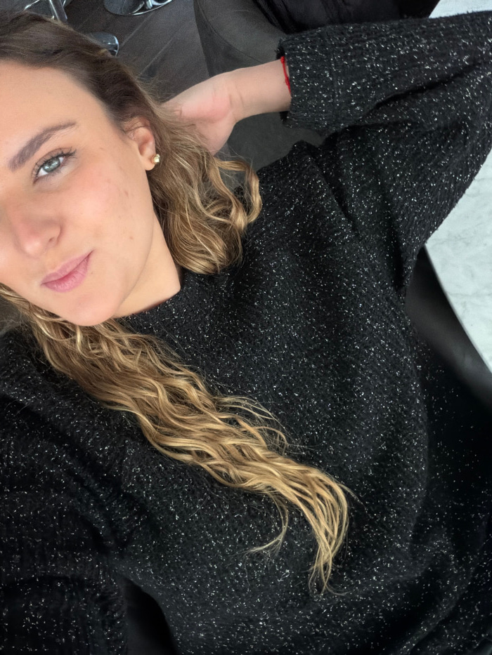 A person with fair skin, light green eyes, and wavy blonde hair, partially visible, lies on a dark speckled surface. The person's face is turned towards the viewer, with a slight smile. The clothing a…read more
