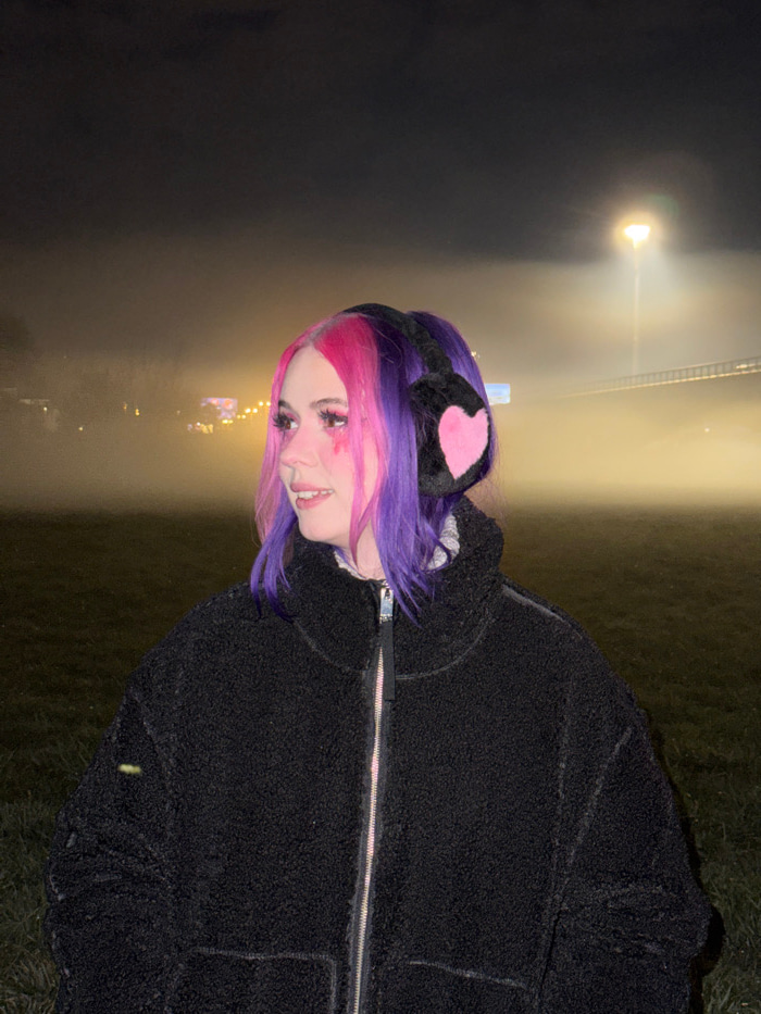 The image displays a single individual, appearing female, positioned centrally in a nighttime outdoor environment characterized by dense fog. The individual's hair is dyed in two distinct colors: brig…read more