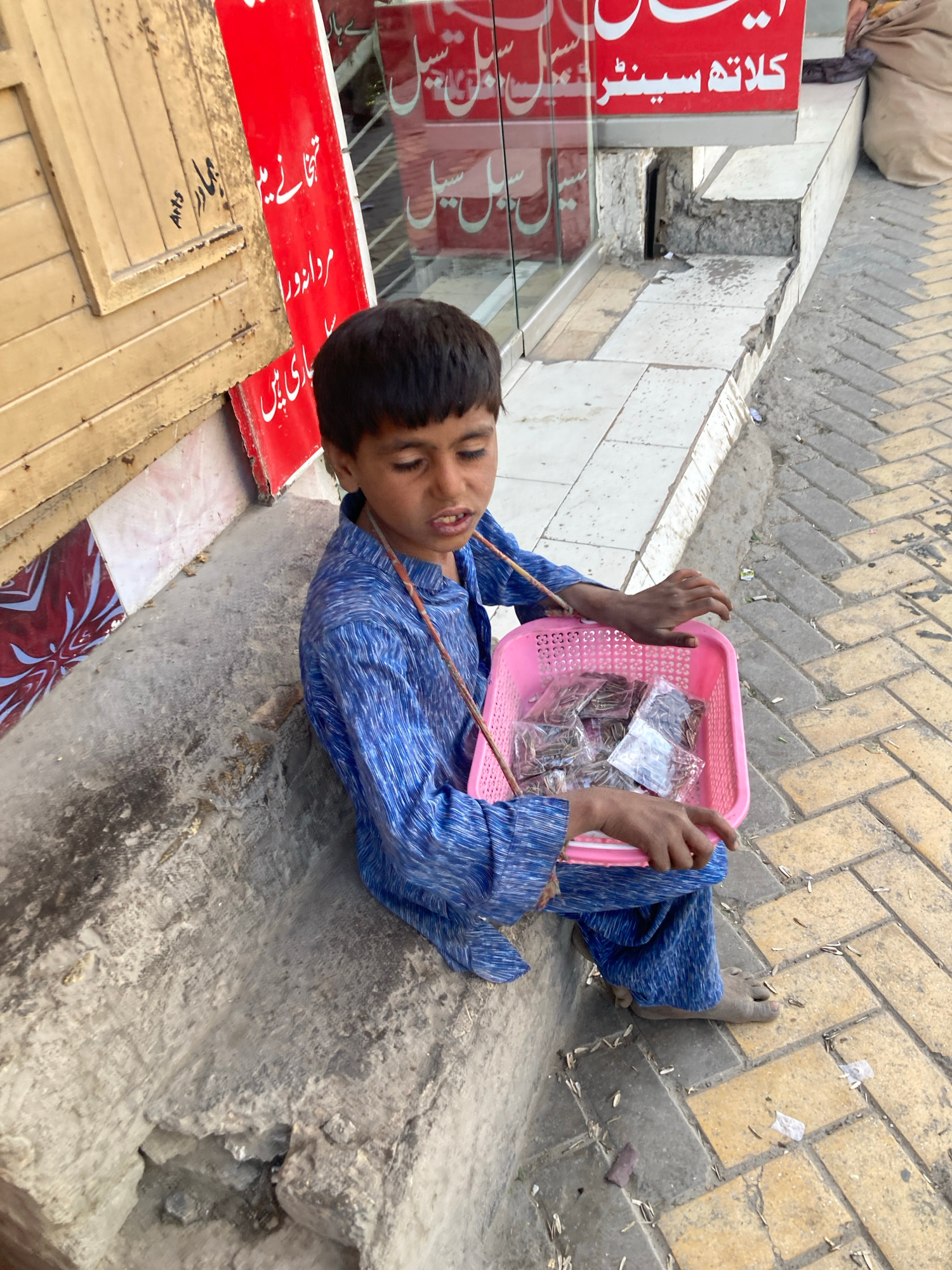A young boy sits on the sidewalk next to a building in Quetta City Tehsil, Pakistan. He wears a blue patterned shirt and holds a pink plastic basket filled with small, individually wrapped packages. T…read more