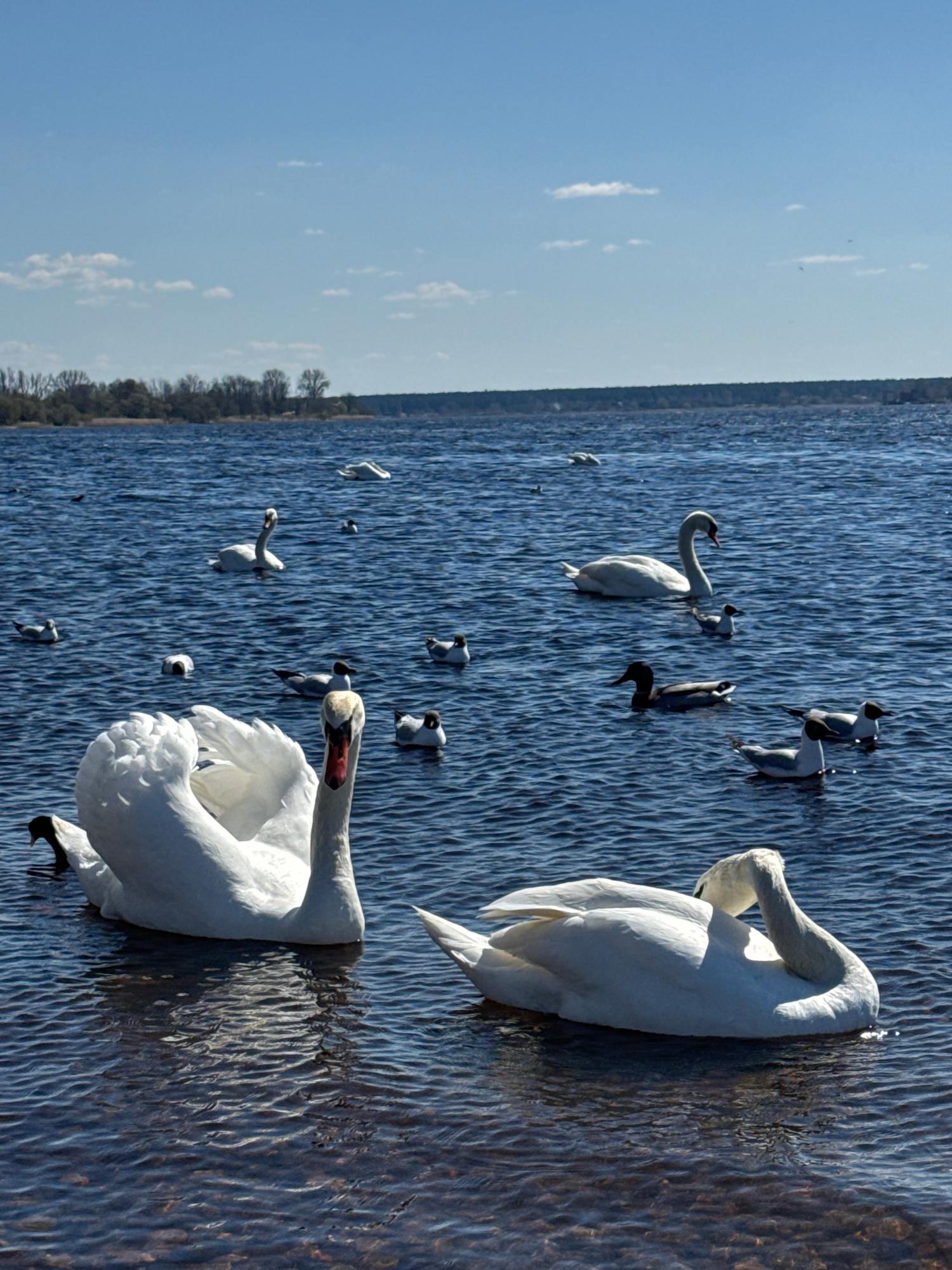 The image captures a scene on a body of water, possibly the Daugava River in Riga, Latvia, given the presence of swans and ducks. Two prominent white swans occupy the foreground, partially submerged i…read more