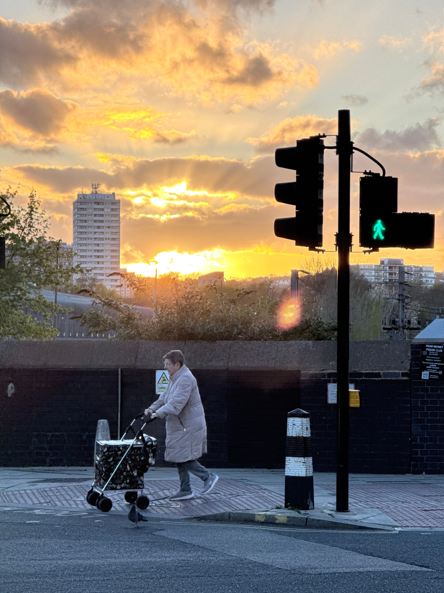 A pedestrian walks along a London sidewalk at sunset. The traffic light is green. A tall building can be seen in the background. The pedestrian is pulling a shopping cart.