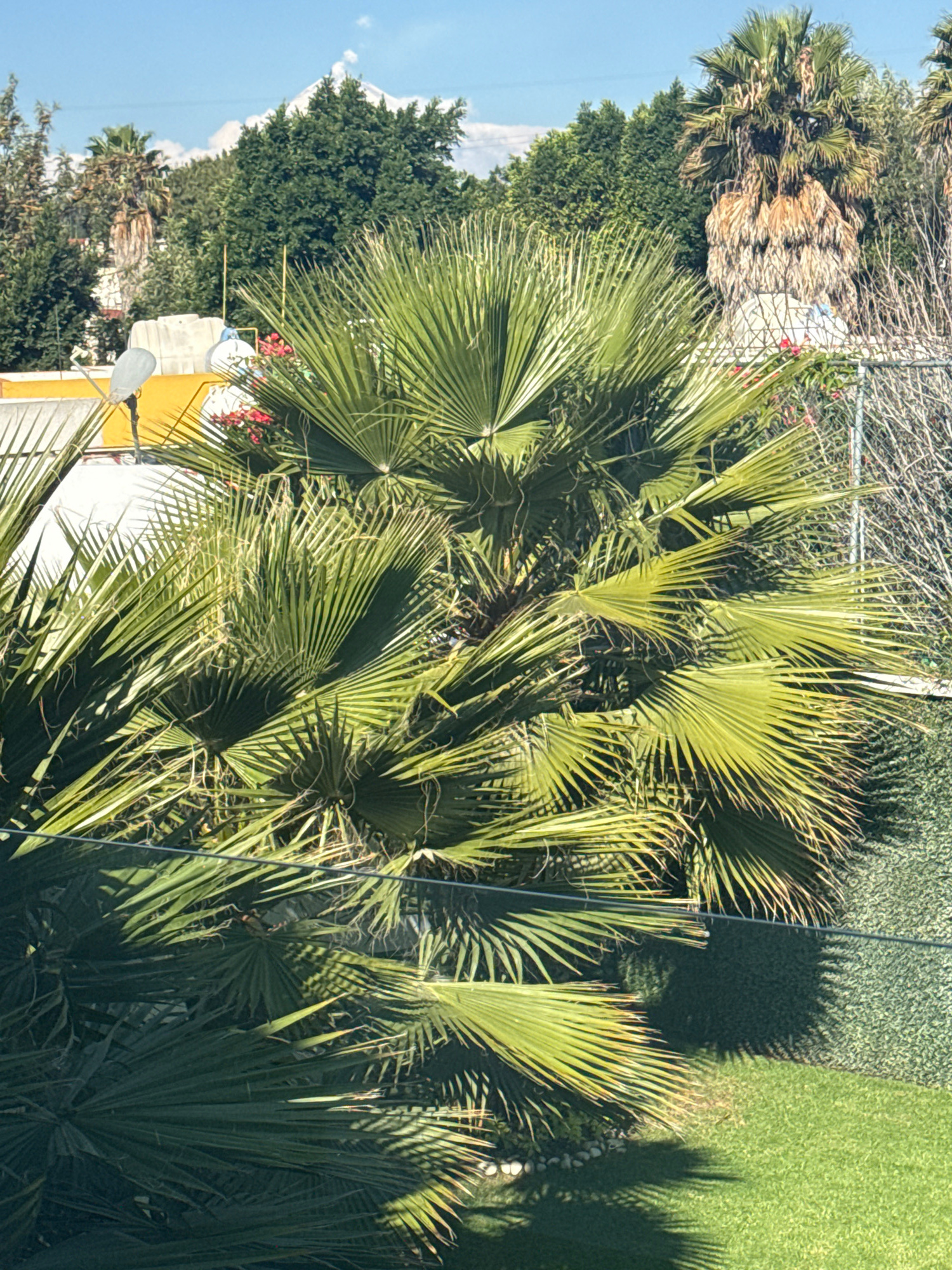 The image presents a view predominantly filled with various green plants and trees under daylight conditions. In the upper portions of the image, a section of a fence is visible. Shadows cast by the f…read more