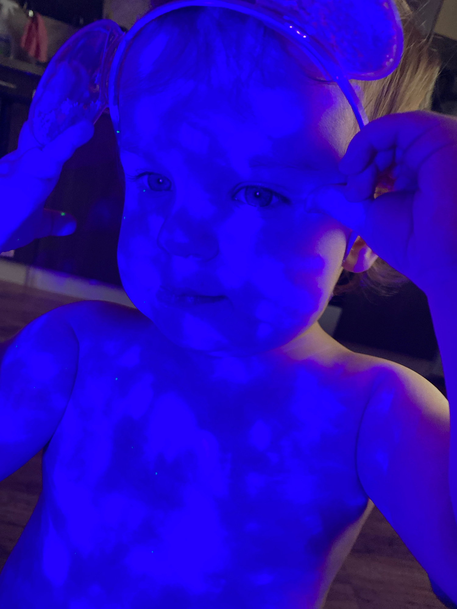 A child is exposed to blue light, possibly for medical or aesthetic purposes. The child is holding an object or device emitting blue light. Their face and body are illuminated by the light. The backgr…read more