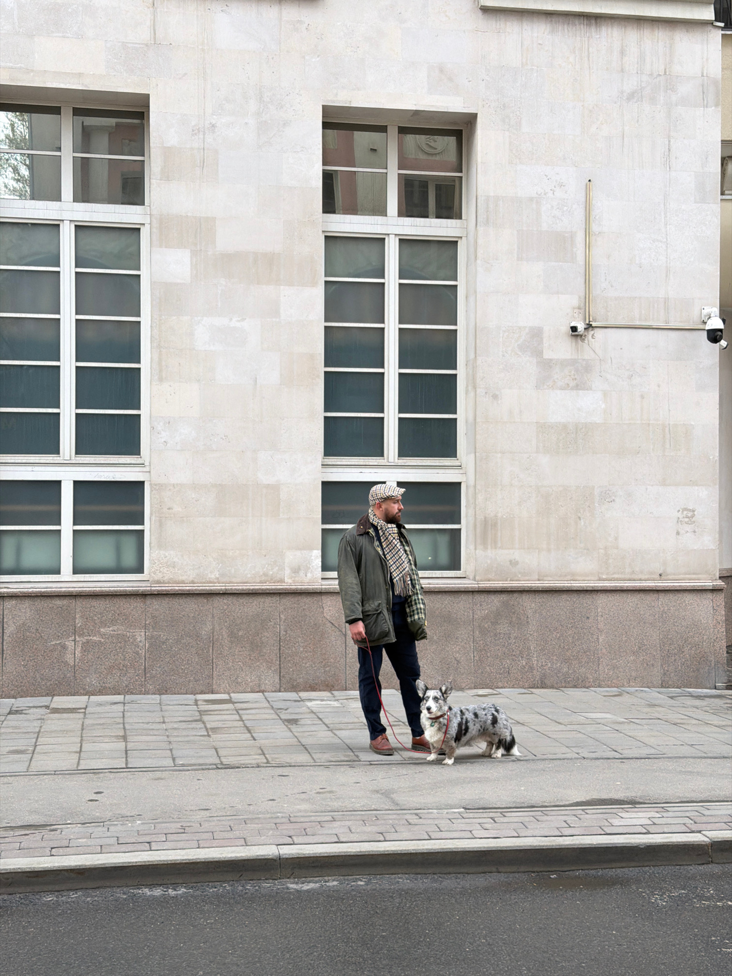 A man in a green jacket, plaid scarf, and hat walks a gray, white, and black spotted dog on a leash along a sidewalk in front of a building. The building has several rows of windows and two security cā¦read more