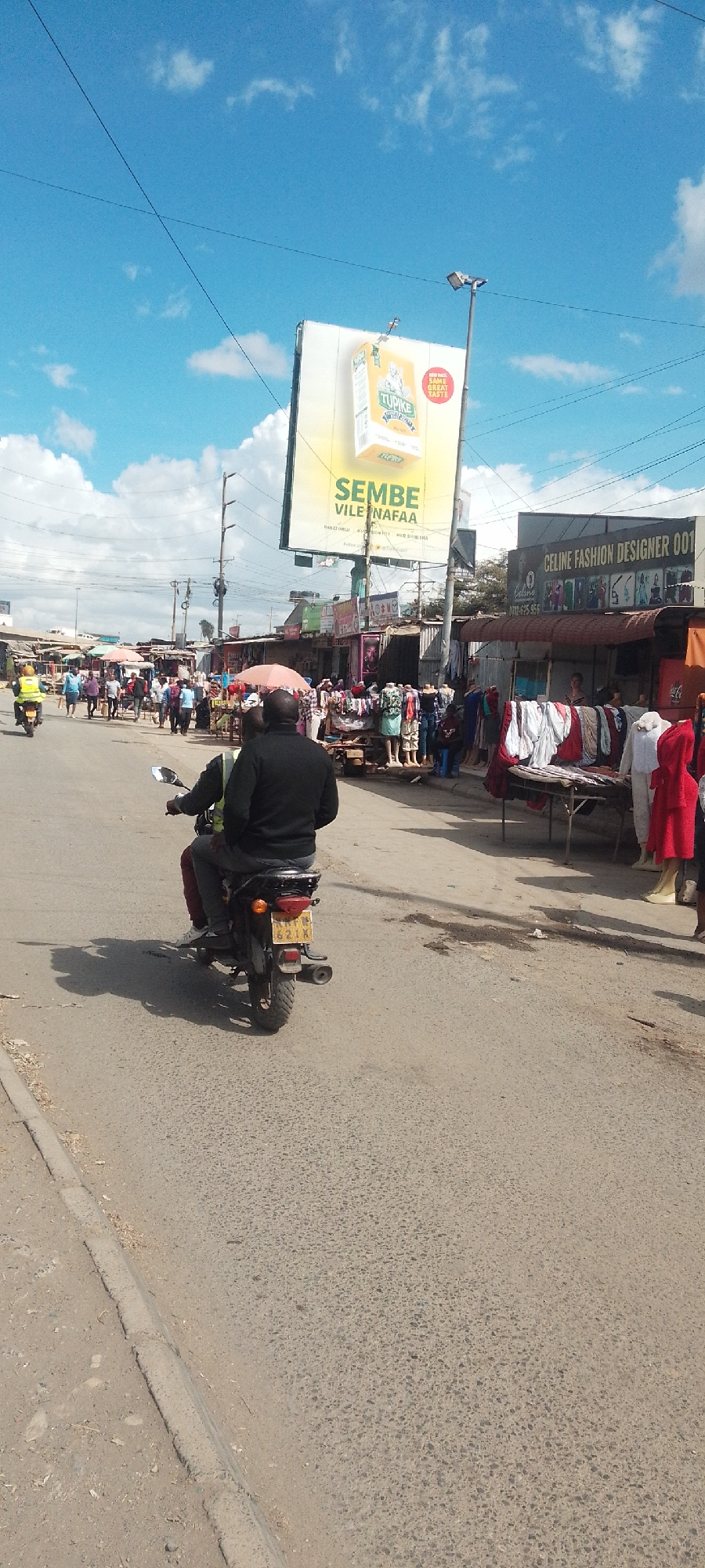 The image depicts a street scene in Nairobi, Kenya, on a day with scattered clouds. In the foreground, a motorcycle with two riders is moving away from the camera. The motorcycle has a yellow license…read more