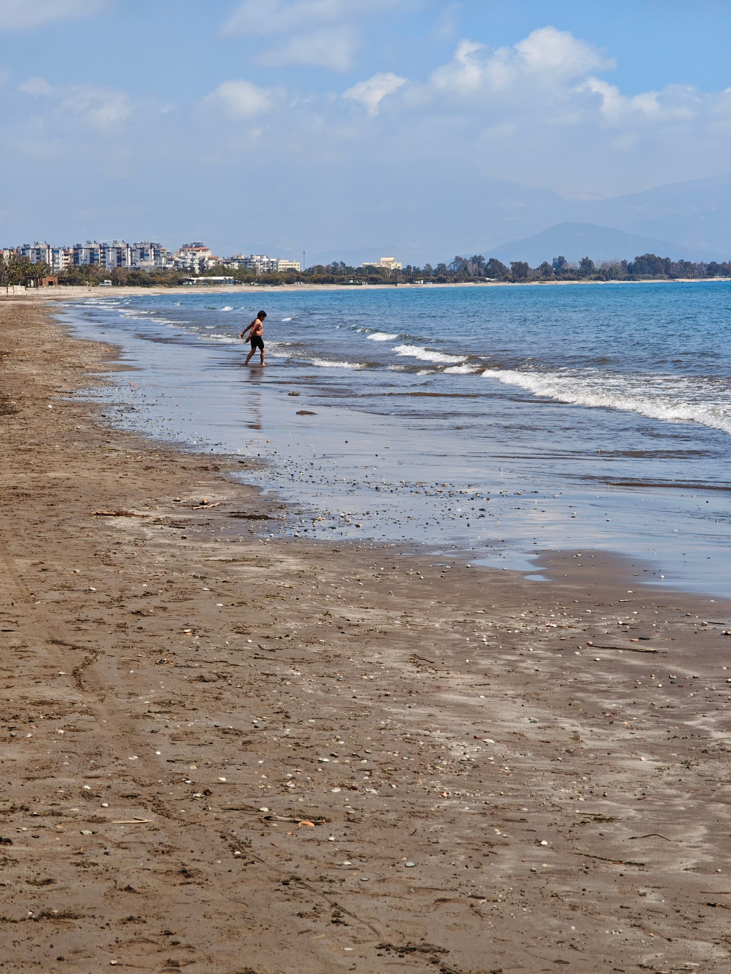 A wide-angle shot captures a beach scene on a sunny day in Finike, Turkey. The foreground consists of a dark, wet sand beach scattered with pebbles and debris, while the mid-ground features gentle wav…read more