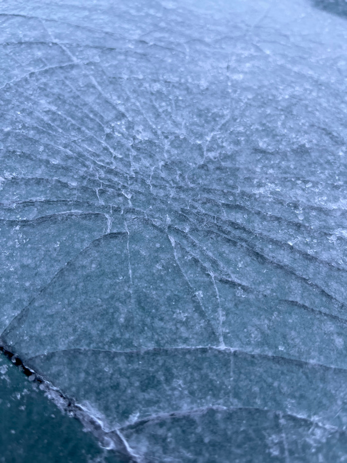 The image shows a close-up of cracked ice or glass with a web of radial and concentric fractures emanating from a central impact point. The surface appears frosted or covered with small particles, add…read more
